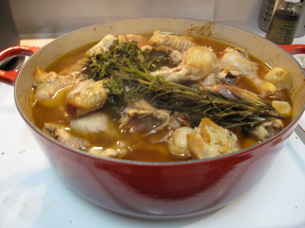 2. Brown the chicken (in batches) and then return them all to the pot with the bacon and onion. Remove the pot from the heat and add the brandy. Carefully ignite, standing well back until the flames subside, then return the pot to the heat. [despite my inner pyro getting excited, I was never able to get the brandy to ignite]