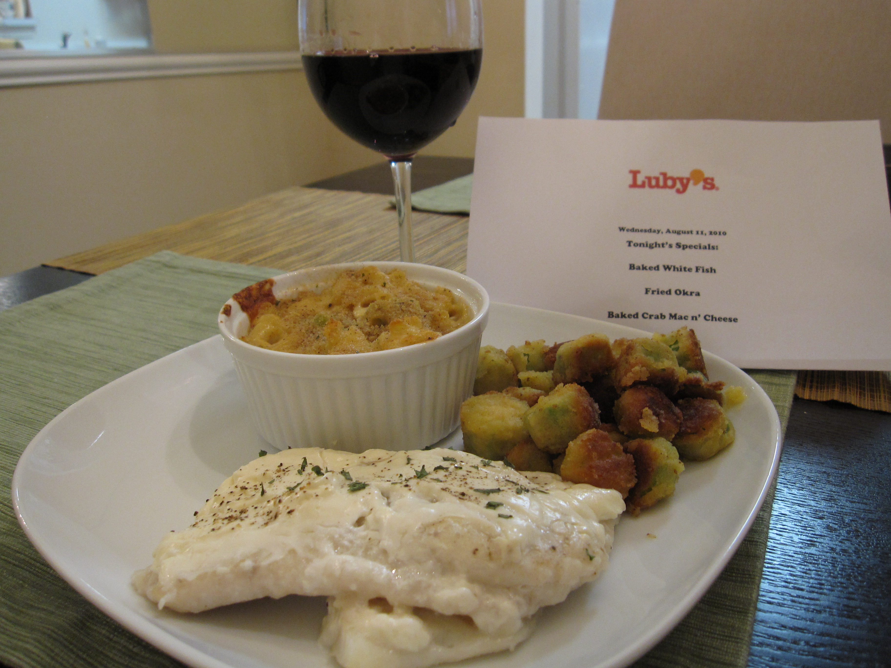 So many things to love about Luby’s – the nice employees with hairnets, the silverware wrapped in warm green cloth napkins, and the food! Chicken fried steak, the massive sized broccoli, baked almondine, blackened tilapia, and who could forget their green jello! I tried to get creative with my menu last Wednesday and created a Luby’s-themed menu: baked white fish, mac & cheese, and fried okra.