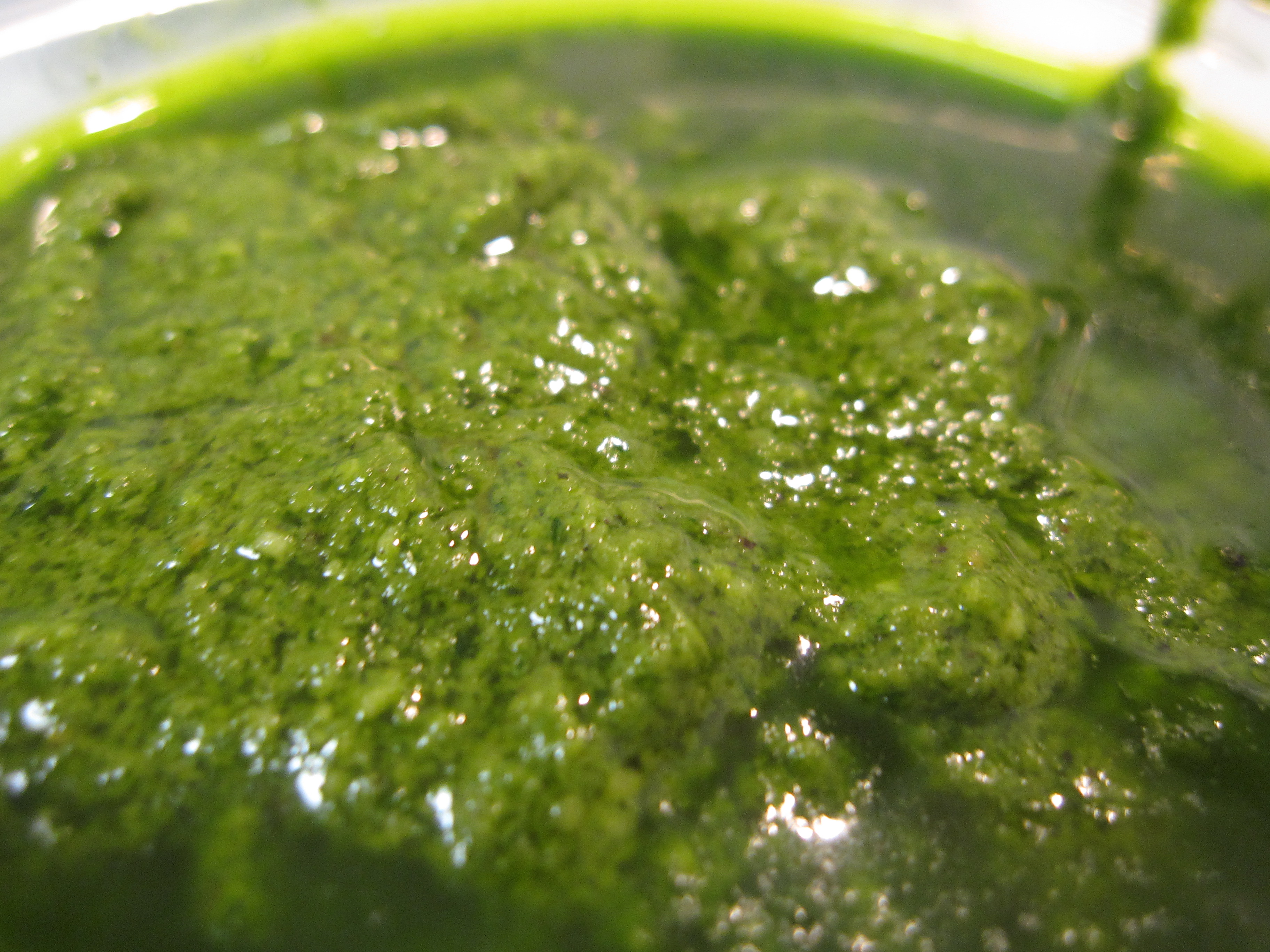 I like store bought Bertolli pesto as much as the next person. But I finally decided to make my own pesto. Didn’t really follow a recipe. Took several handfuls of fresh basil, a handful of fresh parsley, half a handful of fresh cilantro, half a handful of pine nuts…started up the blender and started streaming in EVOO. Added several teaspoons of S&P. As the mixture started to liquify, I blended in a handful of parmesan cheese. And….voila!