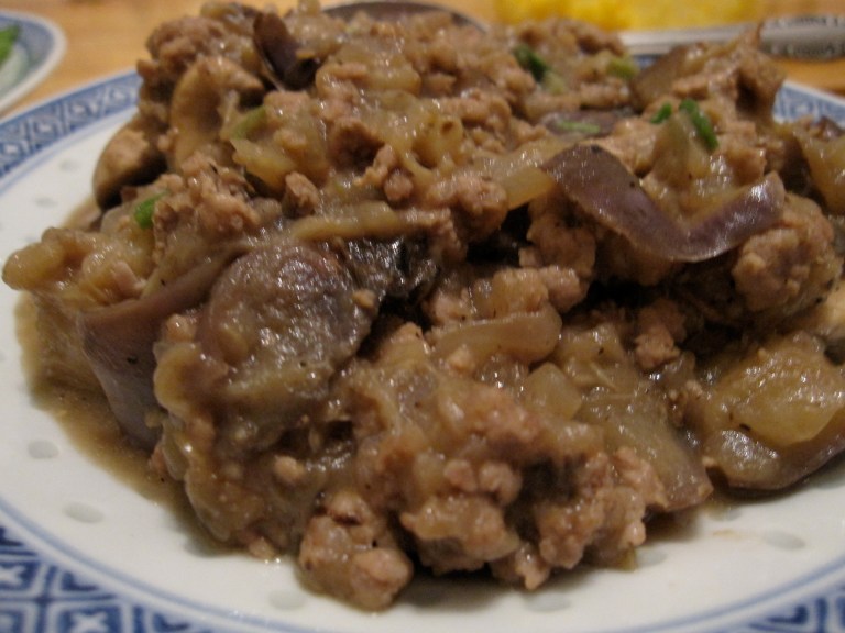 Saute up 1/4 cup of chopped white onions and 1/2 cup of ground pork until cooked. Add sliced eggplant to pot, then add 1 cup of water. Reduce heat and simmer on low. After the eggplant is fully cooked, add in a handful of chopped mushrooms. Mix 2 teaspoons of corn starch, 2 tablespoons of soy sauce, 1 teaspoon of sesame oil, and 2 tablespoons of water together in a separate small bowl. Pour sauce mixture into pan and stir. Season with S&P and garlic chili sauce. Garnish with chopped green onions.