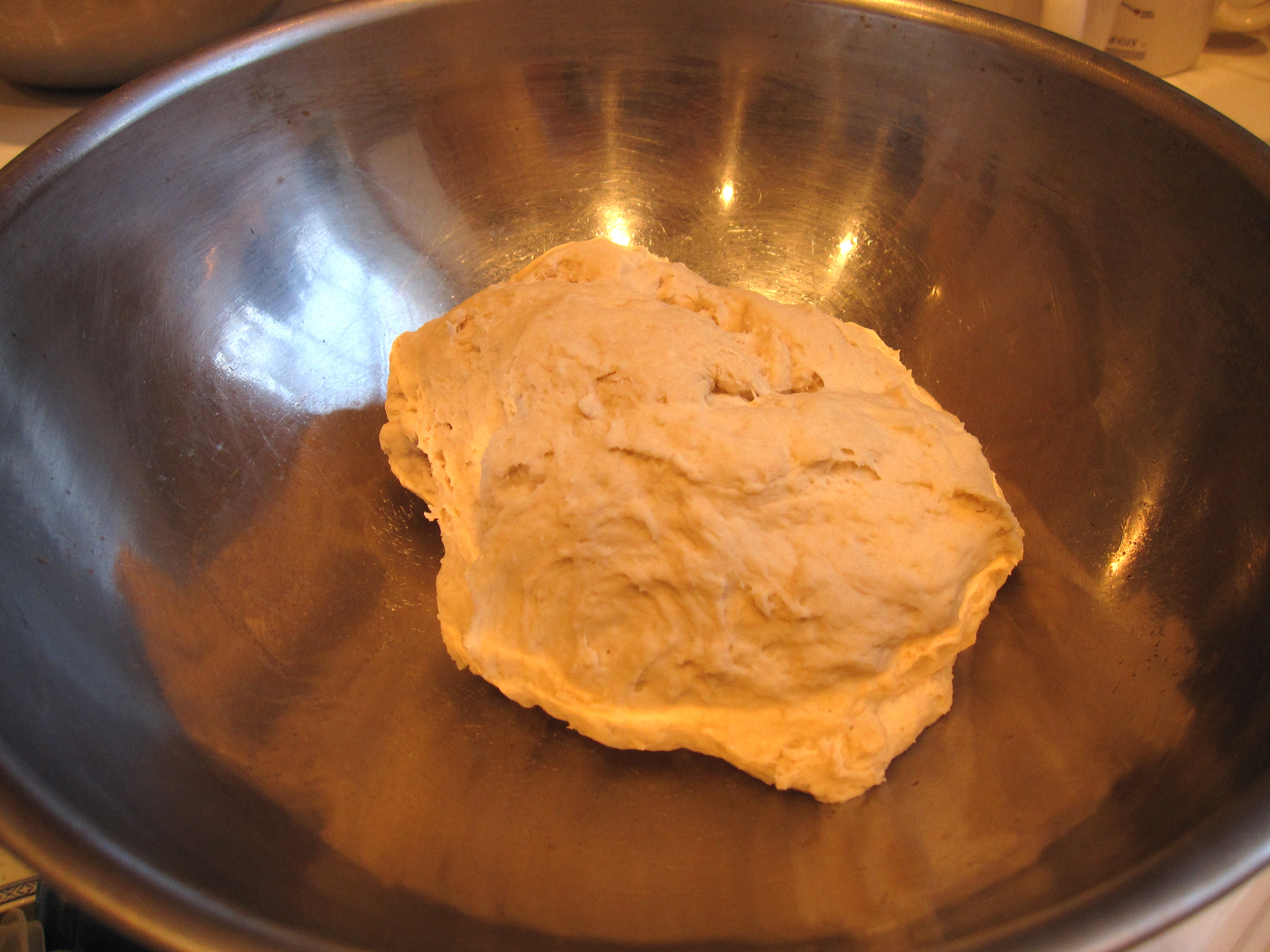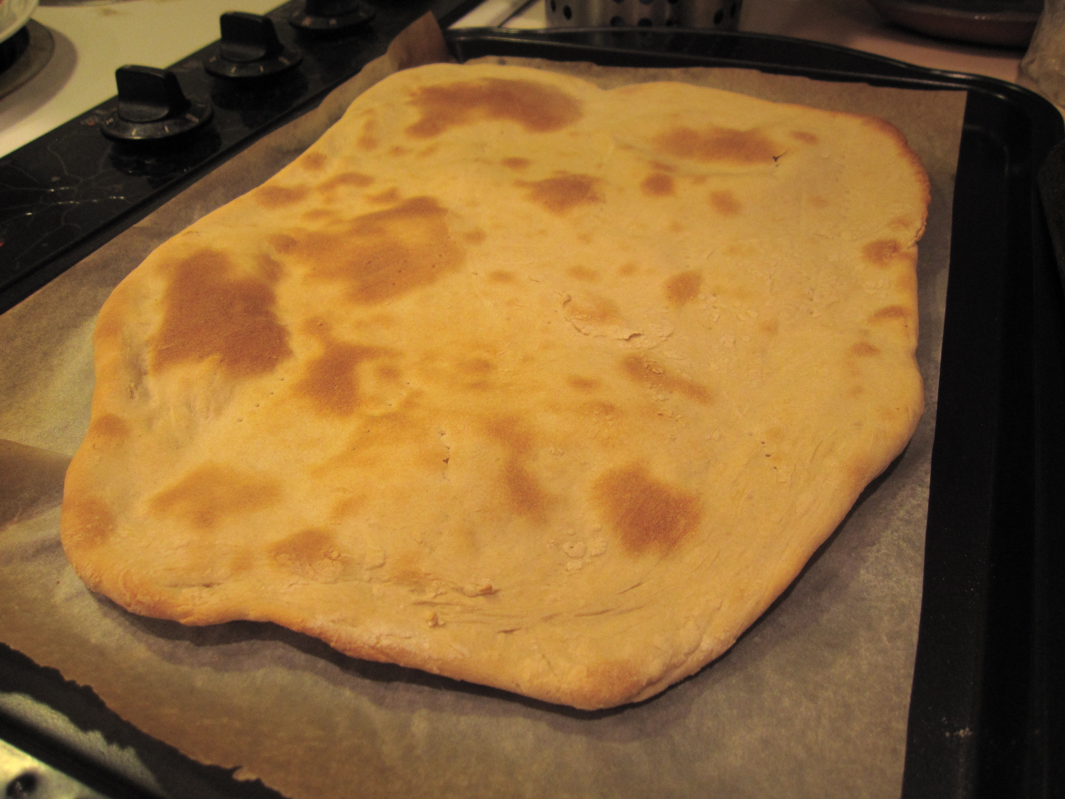After 2 1/2 hours and the dough has risen, preheat oven to 450 degrees. Roll out and flatten the dough into two oven sheets. Lightly oil a baking sheet, place the dough on the sheet and prick the surface with a fork. Bake for 10 to 12 minutes until lightly golden brown.