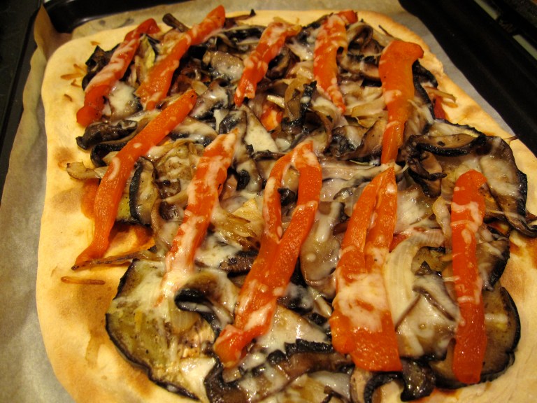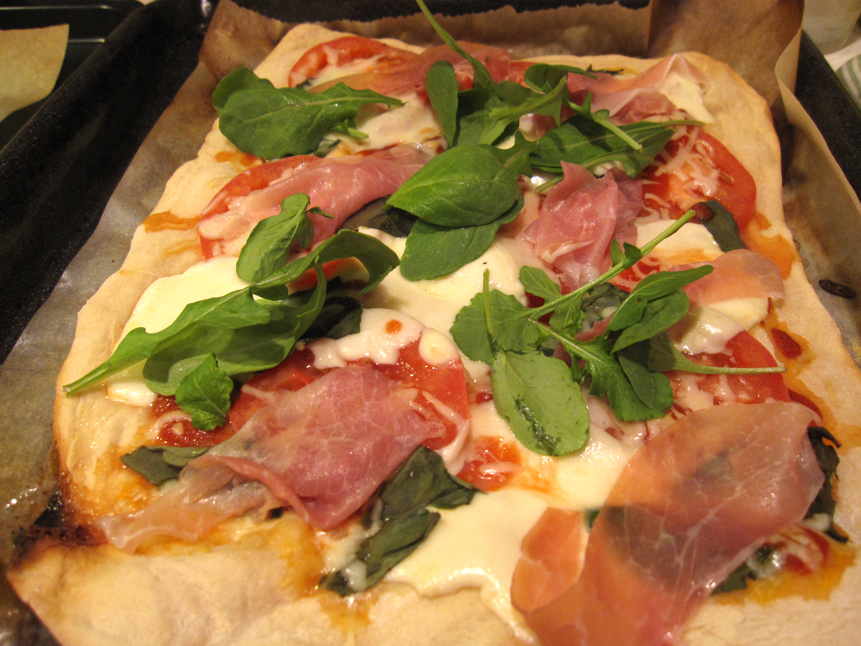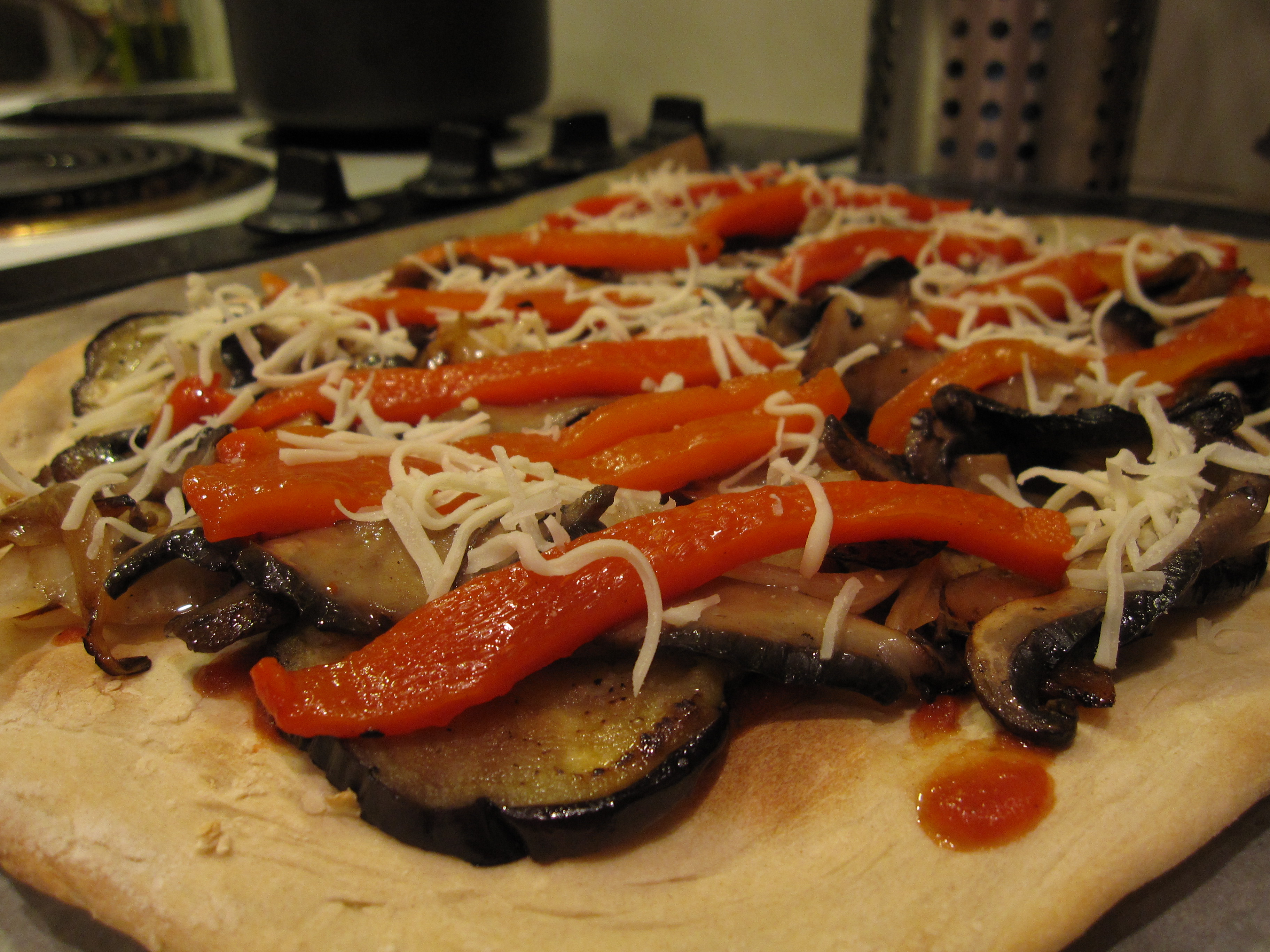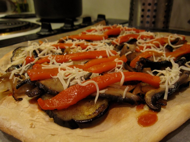 While the dough was rising, I prepared the toppings. The first flatbread was a margherita pizza (sliced tomatoes, fresh mozzarella, basil), and after that was baked, I put prosciutto and arugula on top. The second flatbread was more salty and savory with onions, portabella mushrooms, sliced eggplant, roasted red peppers (store-bought), with shredded mozzarella. I sauteed the onions, mushroom, and eggplant separately before putting it on the bread.
