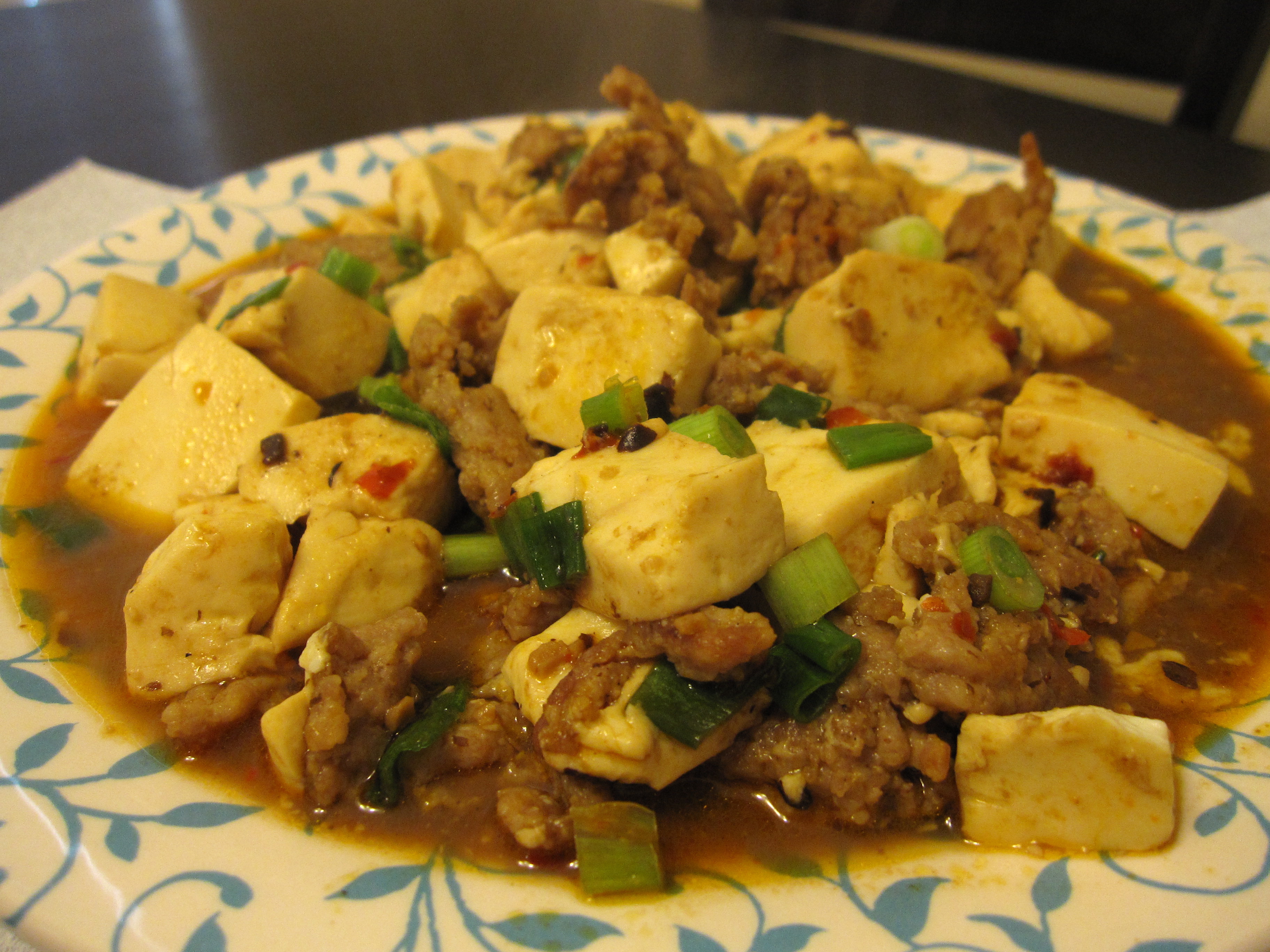 Saute 1/2 pound of ground pork, throw in one package of soft tofu (cut into 3/4 inch cubes), sauce mixture (3/4 cup water, 2 tablespoons of hot bean sauce, 2 tablespoons of sweet bean suace), and a dollop 1 tablespoon of red chili garlic sauce. Toss in chopped green onions at the end.