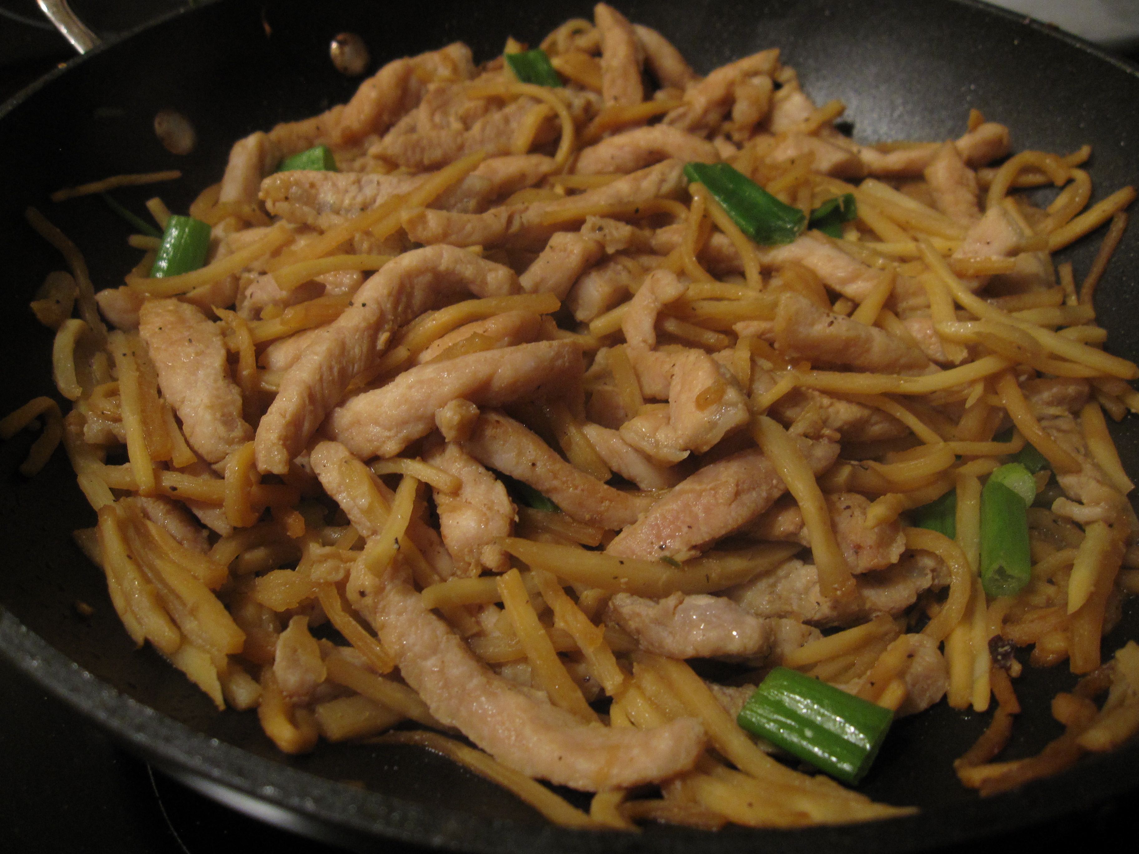 I also made a pork & bamboo dish. Marinate sliced pork tenderloin for 5 minutes in soy sauce, sesame oil, and a little bit of vinegar. Saute the pork and add bamboo shoots. Season with S&P and any additional soy sauce, as necessary.