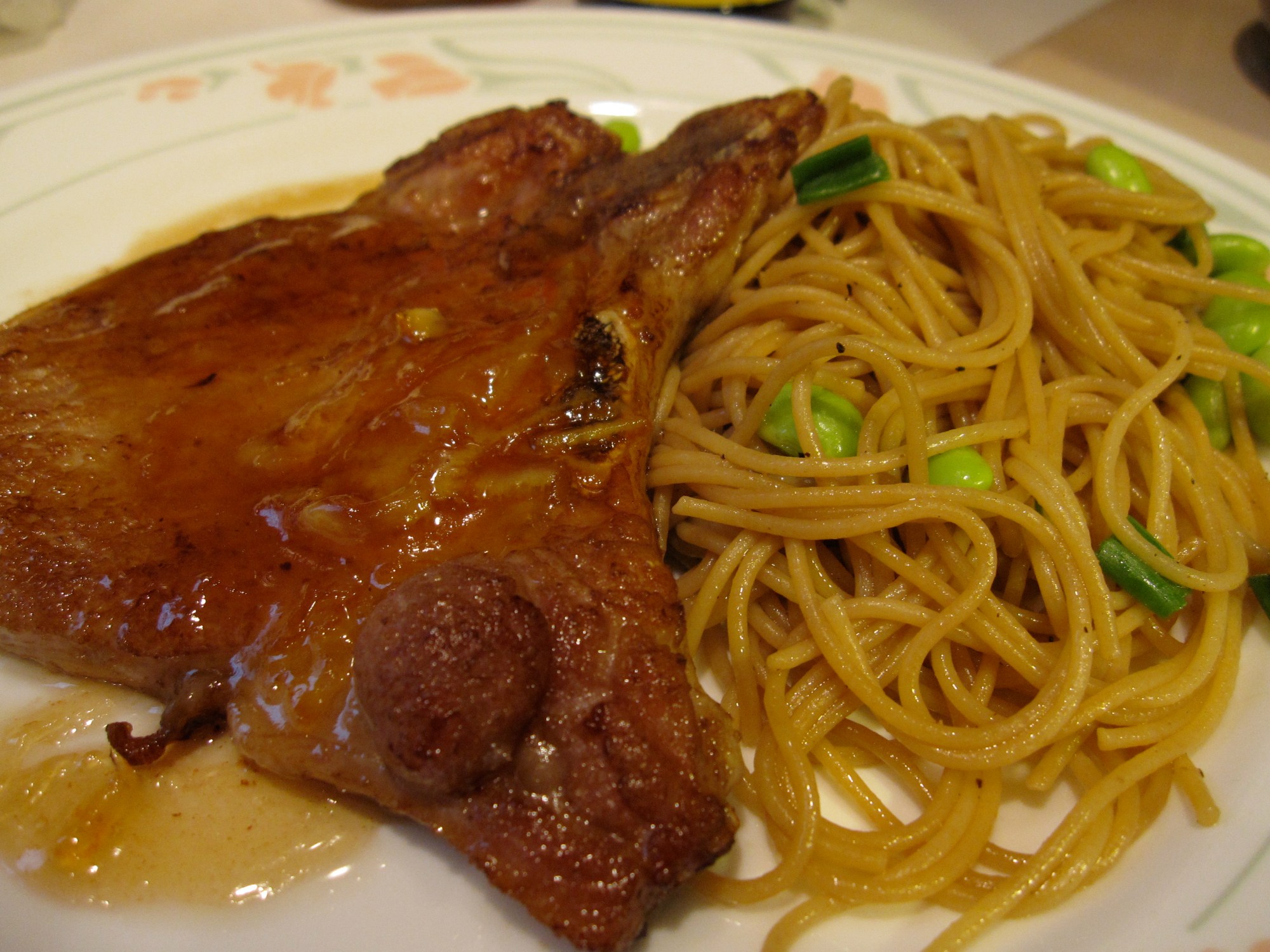 this meal was inspired by an episode of rachael ray that i watched titled “hot and sweet asian fest.” i’ve never seen an authentic asian restaurant make orange-sesame pork chops with teriyaki whole wheat noodles, but heck, i’ll try making it. i didn’t really follow rachael’s recipe at all, but basically borrowed her idea (especially the edamame in noodles part) and made it my own.