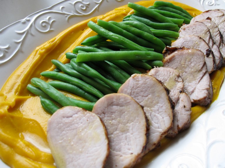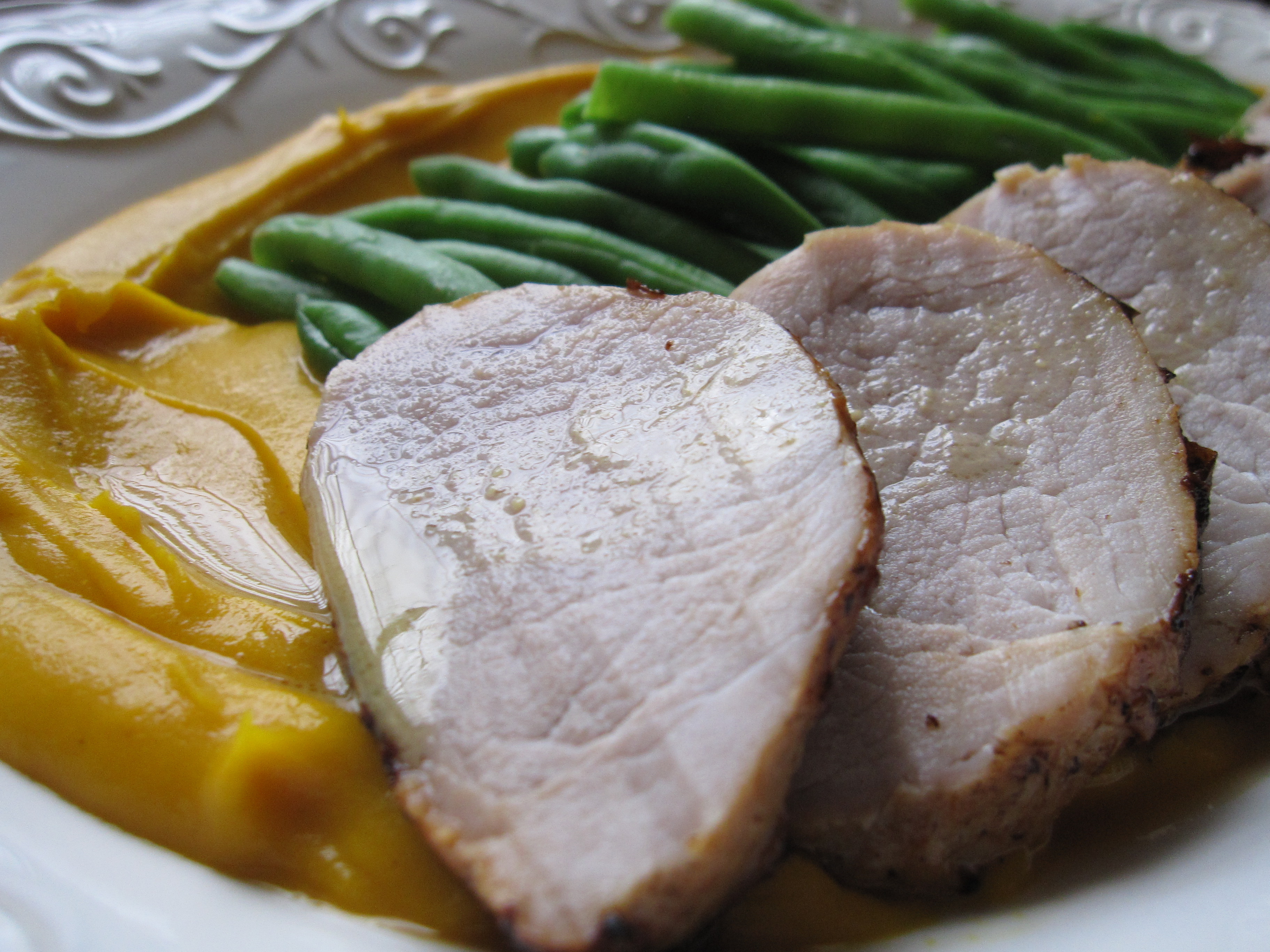 using dean’s dish as an inspiration, i created something similar on my own. i’ll call it a pork tenderloin in maple apple brine, served with honey mustard sauce and a squash puree.
