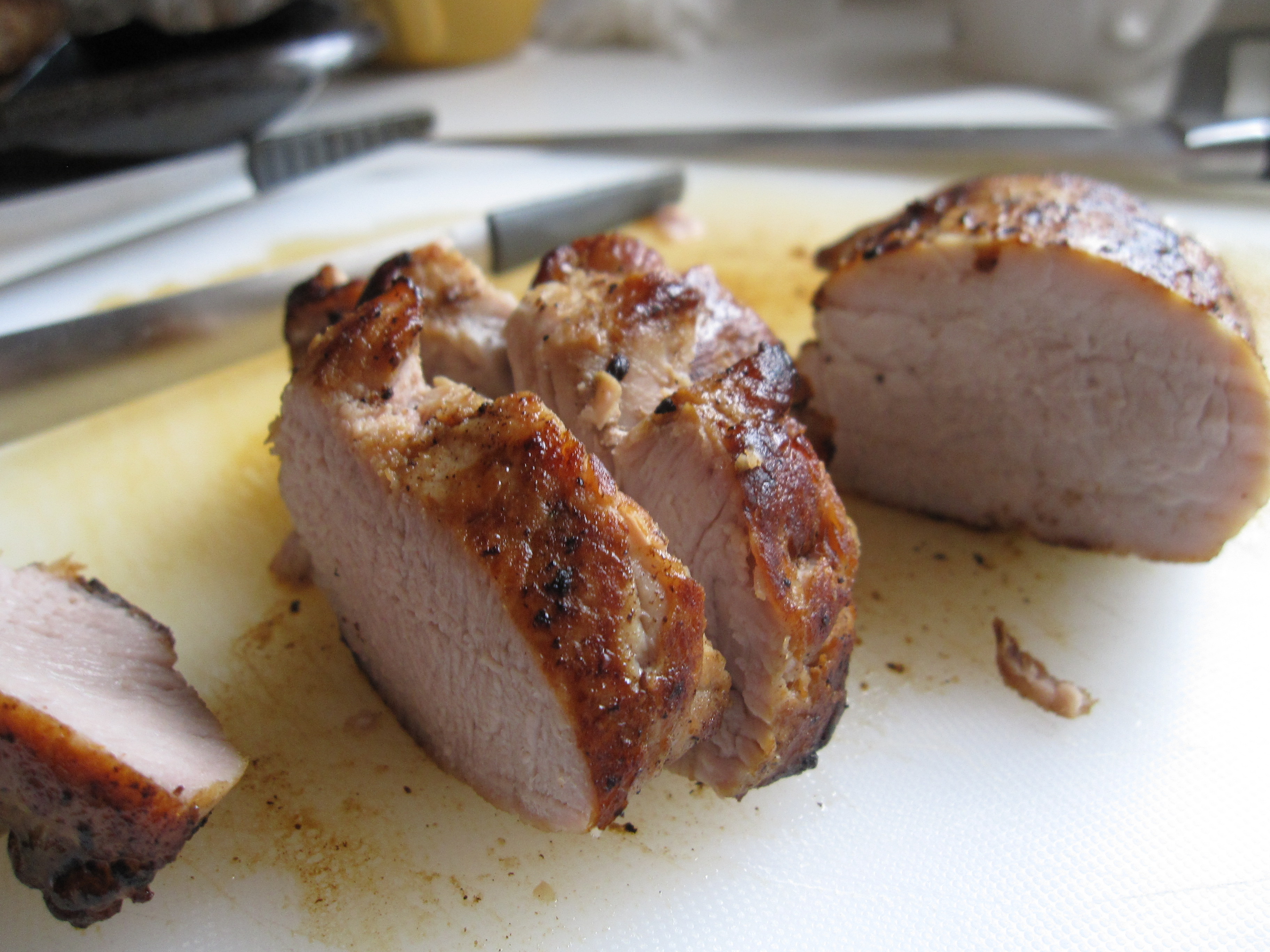 remove pork tenderloin from brine and pat dry. season all sides with cracked pepper. cook tenderloin on medium-high heat so that each side browns (approximately 5-6 minutes total). place tenderloin on baking sheet and bake at 425 degrees for 12-15 minutes. you’ll be tempted to eat the pork right away, but let the pork stand for at least 5 minutes (i waited 10) before slicing, so that all the juices redistribute.