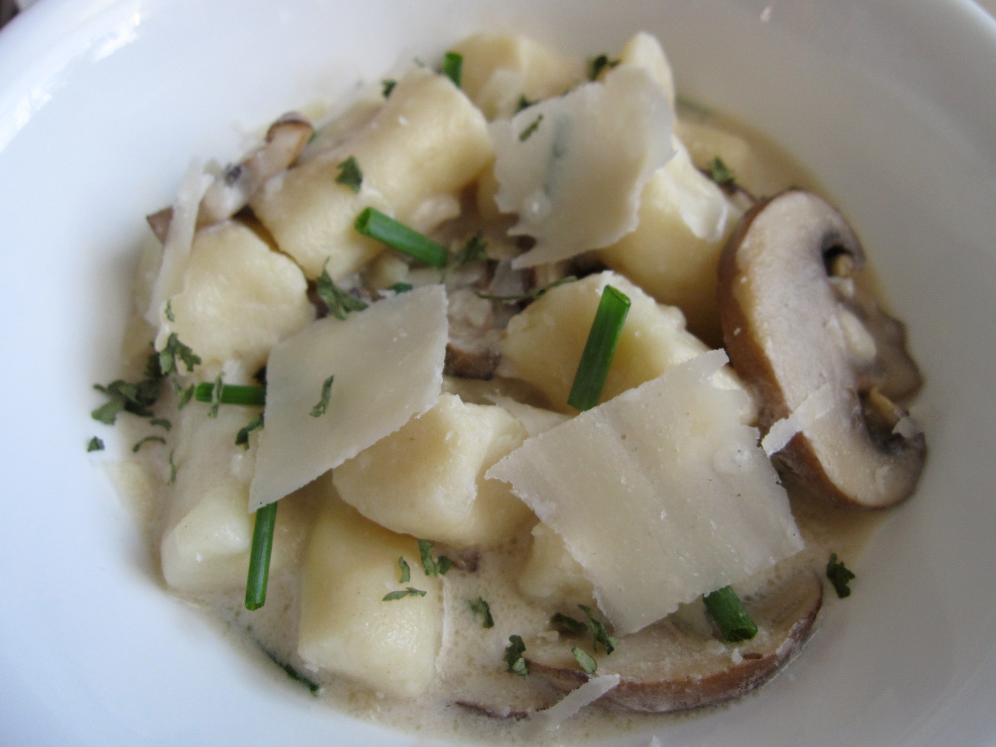 Melt the butter and add EVOO and the sliced mushrooms. When the mushrooms are tender, add the vegetable stock. Once the stock boils, add the heavy cream, stirring until the sauce thickens. If it doesn’t thicken enough, you can make a roux-like mixture with flour and water and add it to the sauce. Once you are satisfied with the consistency of the sauce, add the gnocchi and stir until the sauce is evenly spread out. Plate and garnish with chives, parsley, and fresh parmesan cheese.