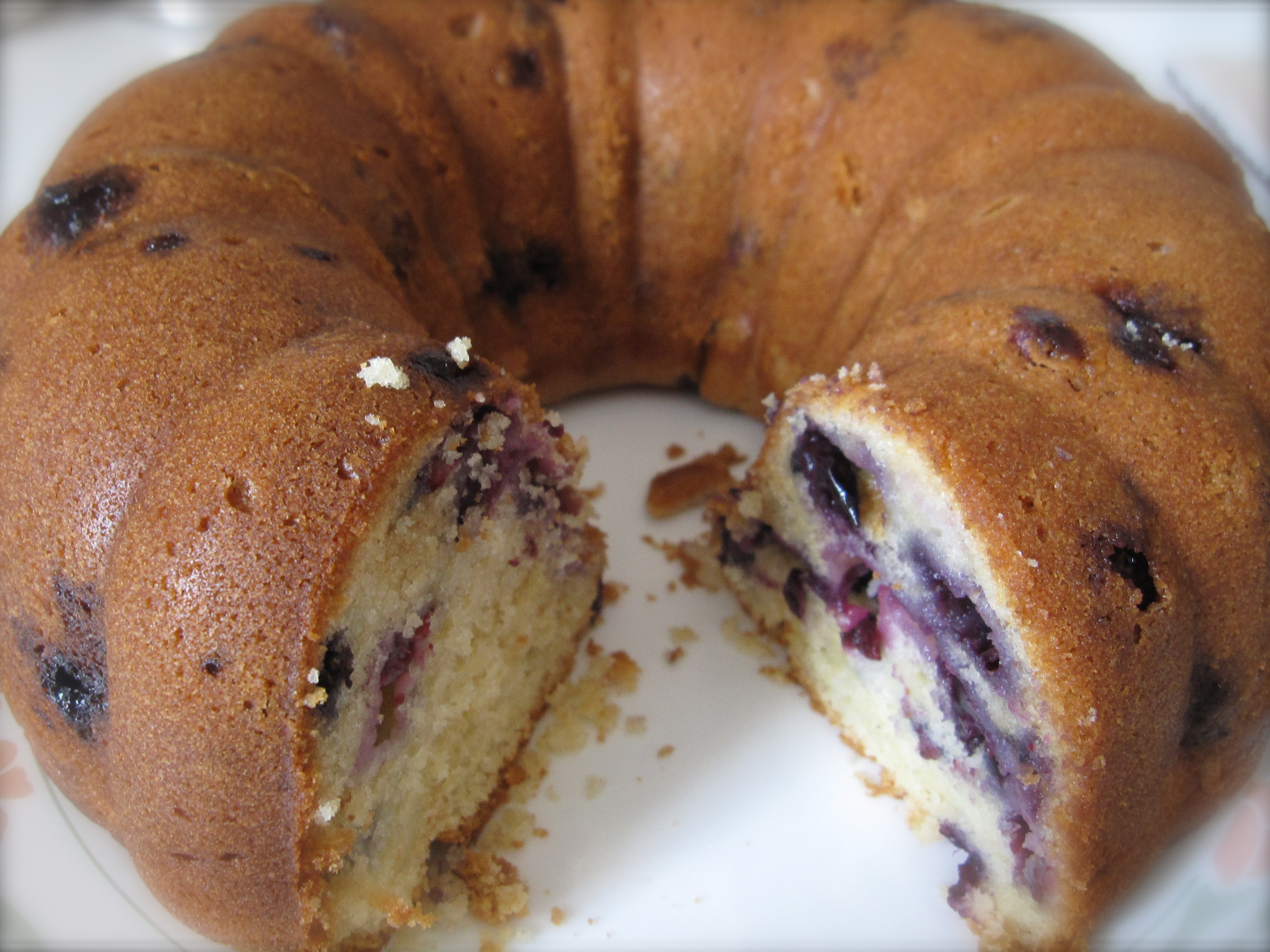 Combine the flour, baking soda, baking powder and salt in a separate bowl. Alternately add the dry ingredients and the sour cream to the butter mixture, blend until smooth. Fold in the blueberries. Bake @ 350 degrees for 55 minutes.