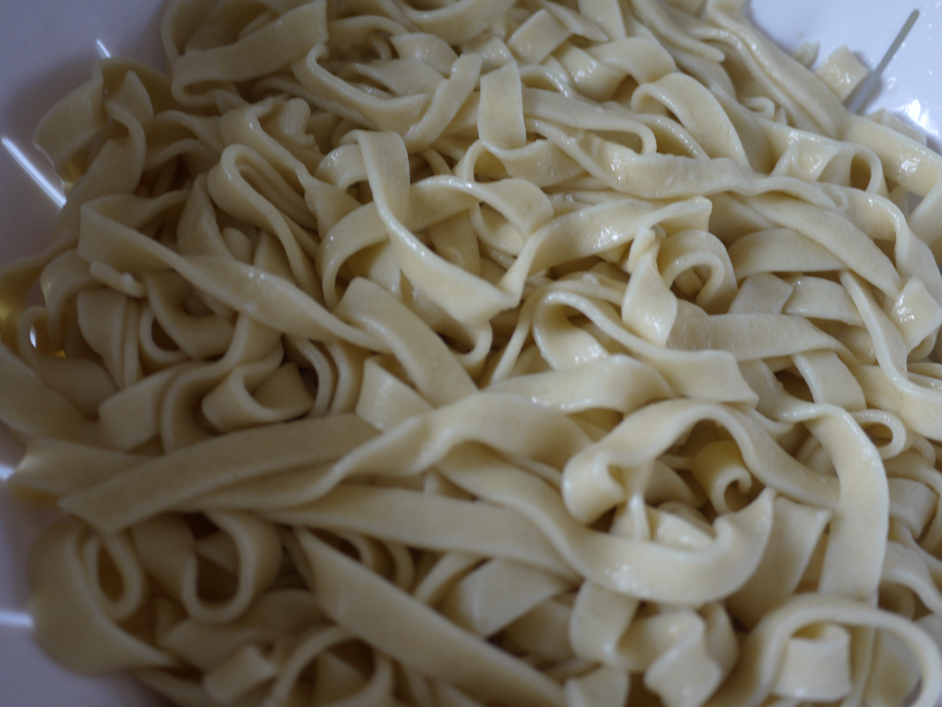 While the meat was stewing, I prepared handmade noodles (two cups flour, two large eggs, 1-2 tablespoons of water) with my kitchenaid (i missed you!). Flattening setting to 4, fettucini cutter.