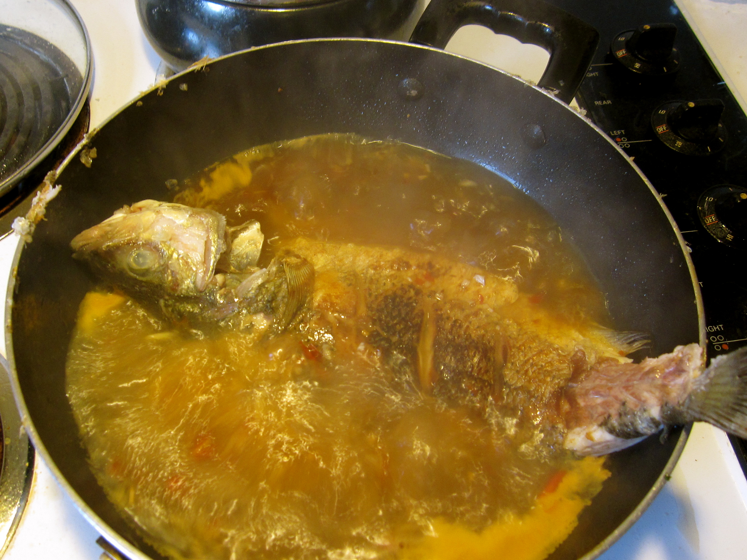 Cook fish for another 3-4 minutes. It’s okay if the fish isn’t completely cooked, it’ll get braised later. Remove fish from pan and set aside. Keep the remaining oil in the pan, add the garlic, ginger, bean paste, soy sauce, and water (start with 2 cups, add more if the sauce is too spicy). When the water comes to a boil, place the fish back into the pan.