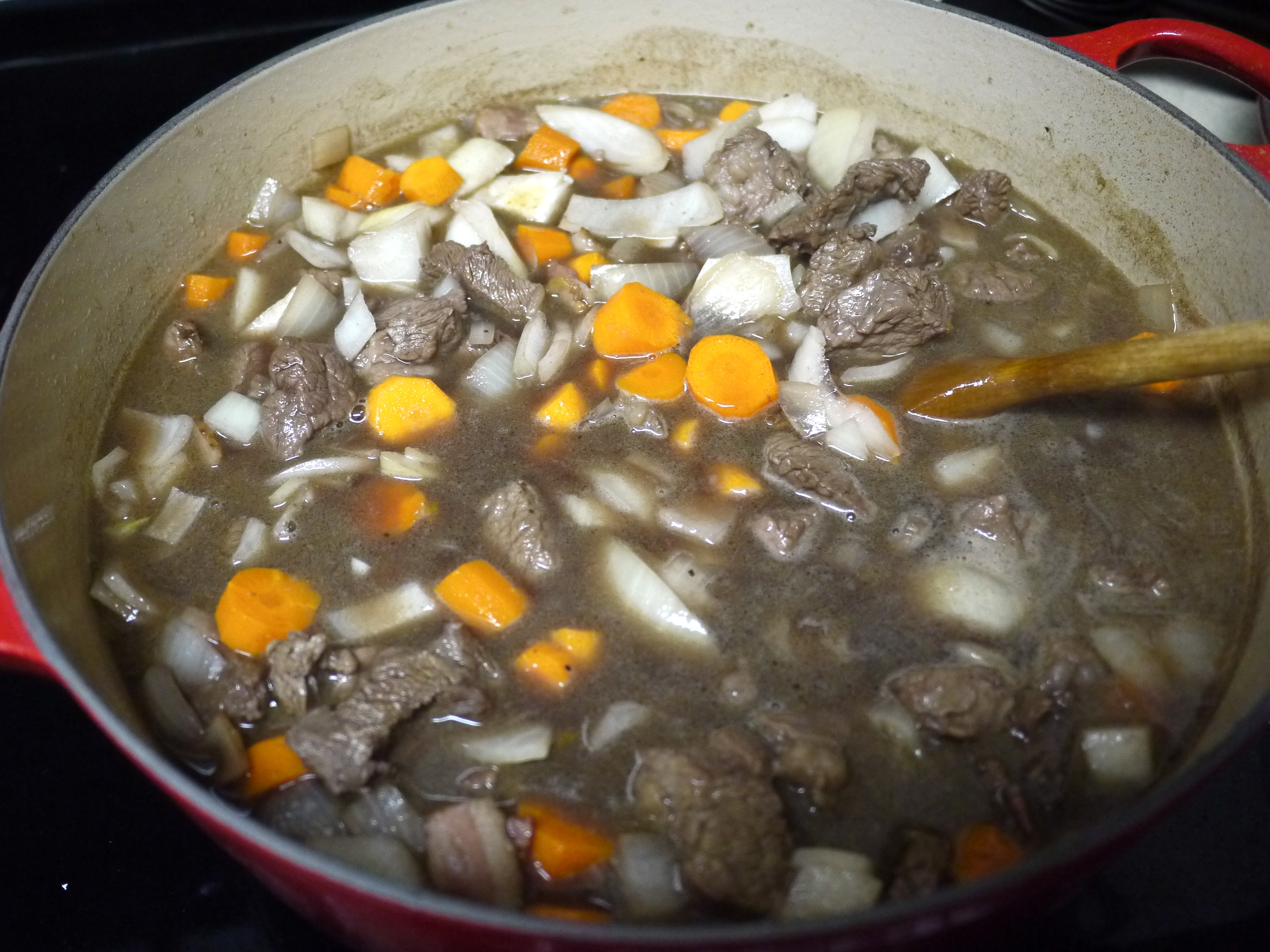 Preheat oven to 375. Saute bacon over medium-high heat until browned in french oven. Remove bacon and set aside. Saute the beef cubes for 5 minutes, until browned on all sides. Add carrots and yellow onion to pot, cooking for another 10 minutes. Add back the bacon, garlic, thyme, and S&P. Add the beef broth and entire bottle of wine. Bring to a simmer. Once simmering, place the lid on the pot, place it into the oven for 2.5 hours @ 375 degrees.