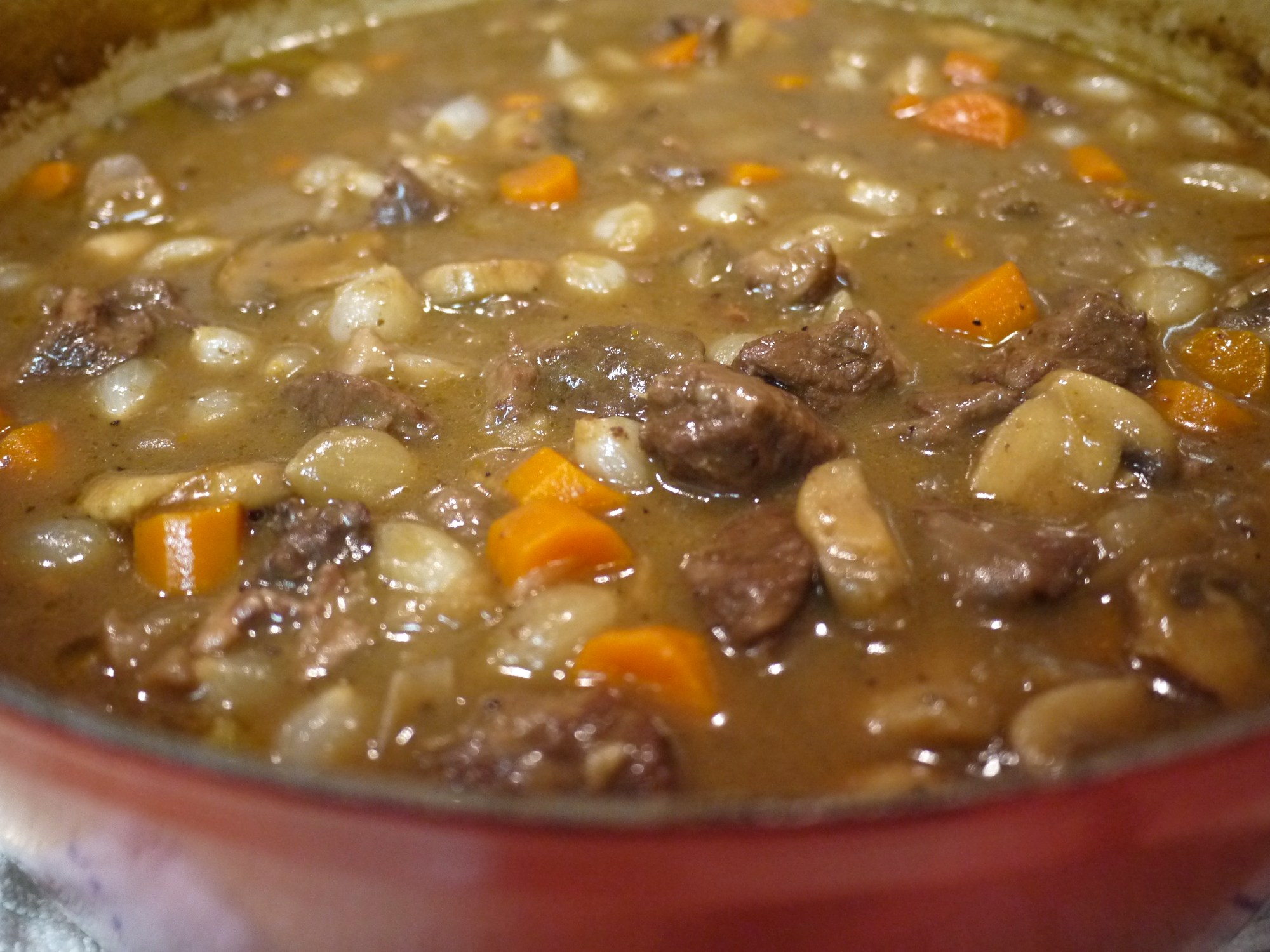 After 2.5 hours, remove the french oven from the oven. Saute the mushrooms in EVOO until wilted and mix into stew. Heat the butter. When the butter is half melted, add in flour and stir until a roux is formed (slightly paste-like). Mix the roux into the stew. Pour in the frozen pearl onions, cover the pot, and place it back into the oven for another 30 minutes @ 375 degrees.