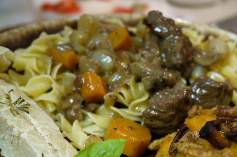 After 30 minutes, remove the french oven from the oven and heat over medium-low heat until ready to serve. Boil the egg noodles, add EVOO in the water to prevent noodles from sticking. Ladle a GIANT scoop of boeuf bourguignon over the egg noodles and serve.