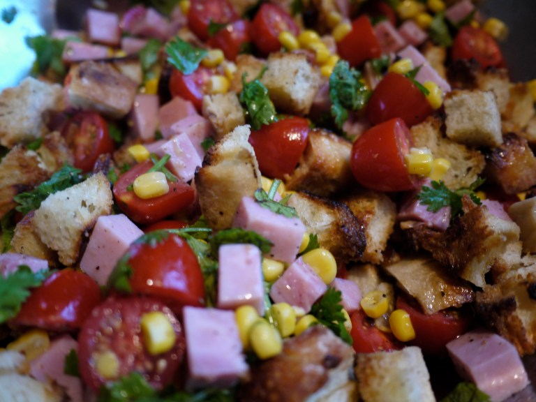this summer salad is essentially another version of this one. instead of shrimp and okra, i used diced ham and toasted & cubed garlic bread [which make it crunchy like croutons]. add chopped cherry tomatoes (halved), 1 can of sweet corn kernels, chopped cilantro, 1 tablespoon of lemon juice, and 2 tablespoons of EVOO. DONE.