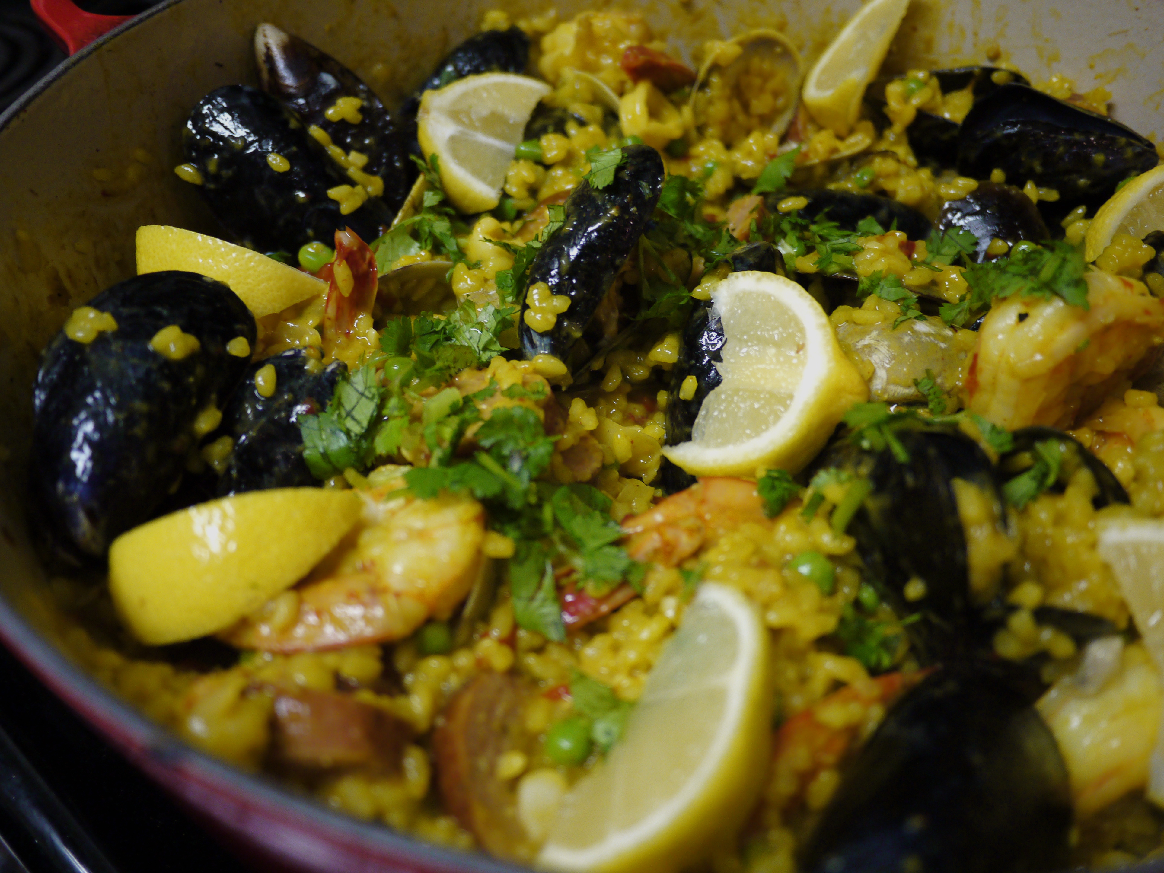 seafood paella is an annual tradition of mine. the steps of making paella are extremely easy, but washing, cutting, and sauteing everything separately is too time consuming that i only have the energy to do it once a year. the process takes at least 2 hours from start to finish. i used to make my paella in a special paella pan, but i could never get the socarrat (or crispy bottom) right, so i gave up and decided to switch to using my le creuset this year. if anyone knows how to make the socarrat without burning the rice, please teach me!