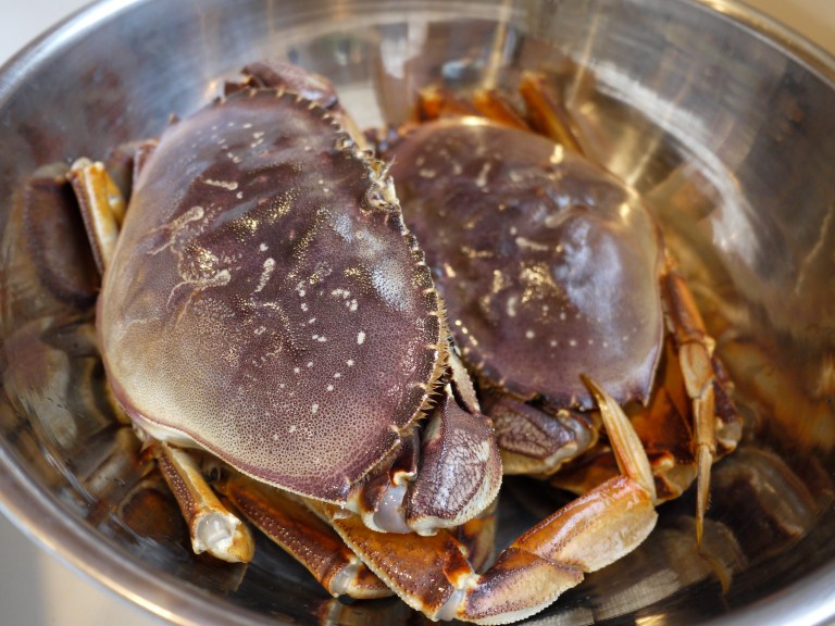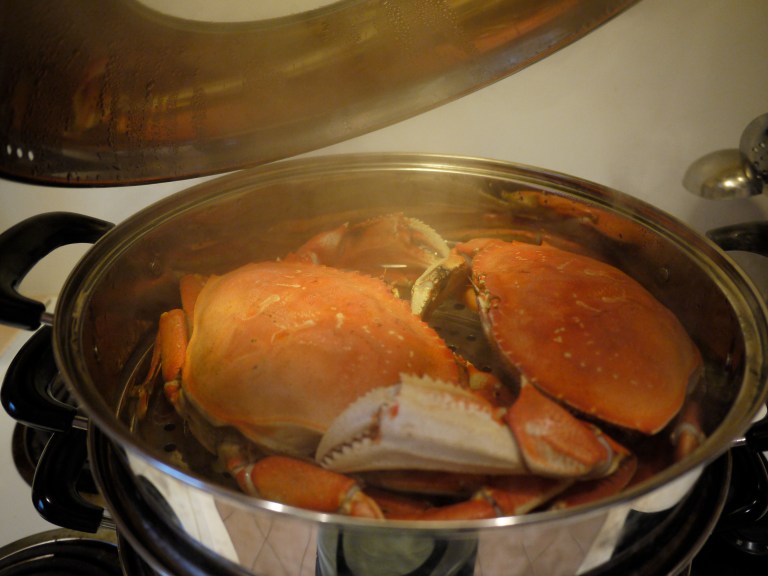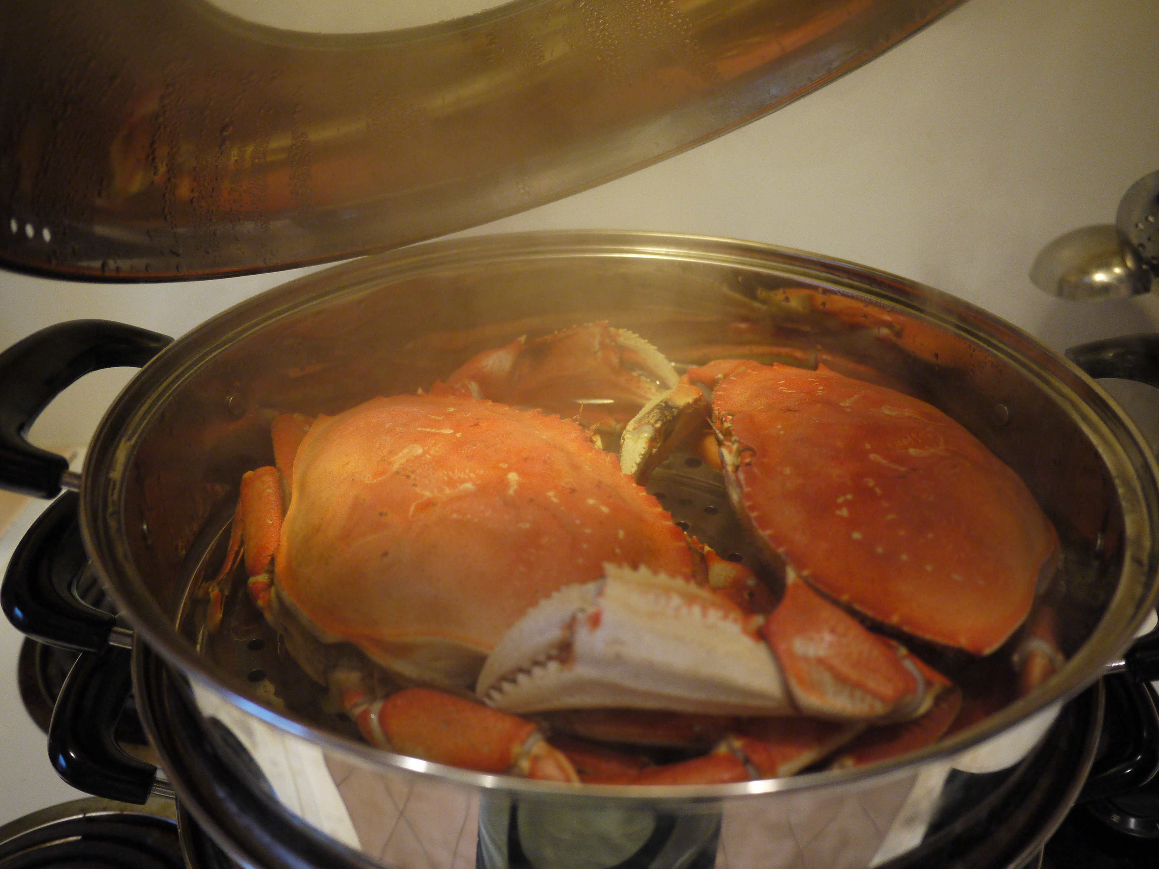 Here are the actual instructions. Clean the crabs with a textured sponge. DO NOT cut off the rubber bands around the claws. Fill up the bottom pot of a layered steamer halfway with water, let it boil, throw the crabs in the top layer, and steam for 12-15 minutes, or until the shells turn bright red. [my enemy is the one on the left bottom]