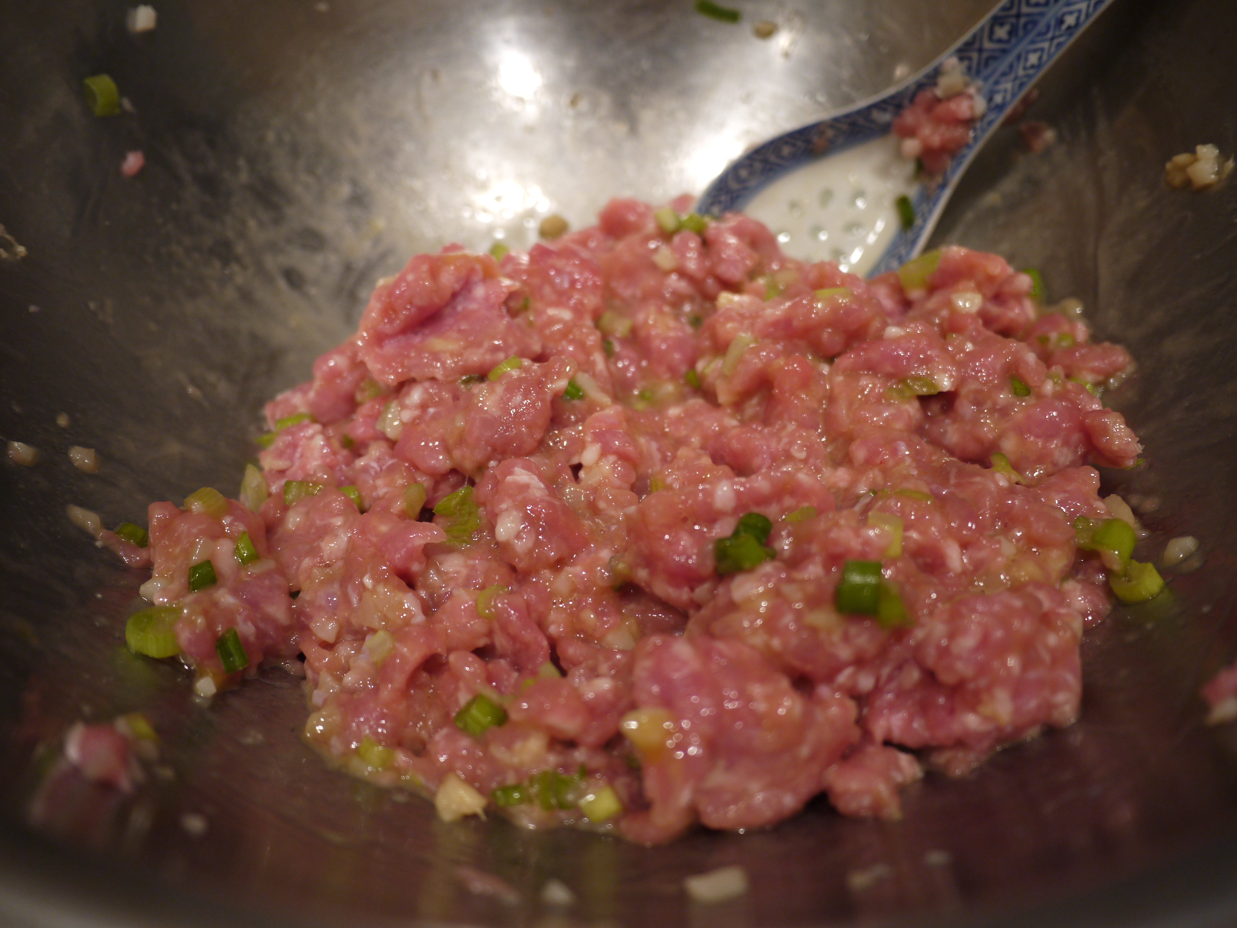 Mix the pork, water chestnuts, ginger, and green onions in a large bowl. In another bowl, mix the white pepper, cornstarch, rice wine, soy sauce, sesame oil, peanut oil, and egg together. Pour the liquid mixture into the larger bowl and mix thoroughly.