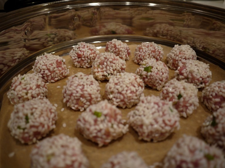 Transfer the rice (pat dry with paper towels, if necessary) to a small bowl. Remove the pork balls from the freezer. Roll the balls in rice, trying to cover the full surface in a single layer of rice. When done, line the pork balls in the steamer tray with parchment paper roughly 1/2 inch apart.