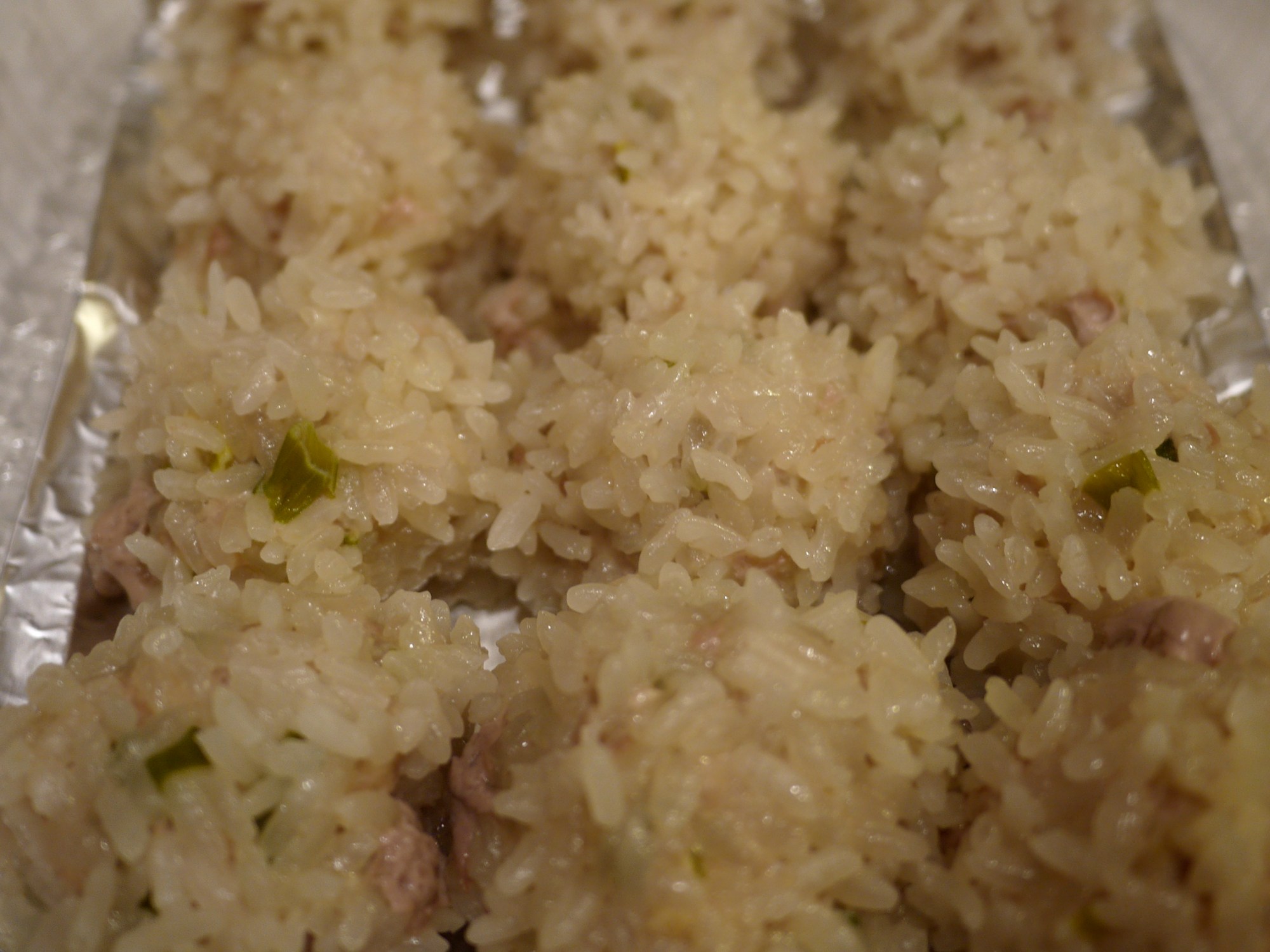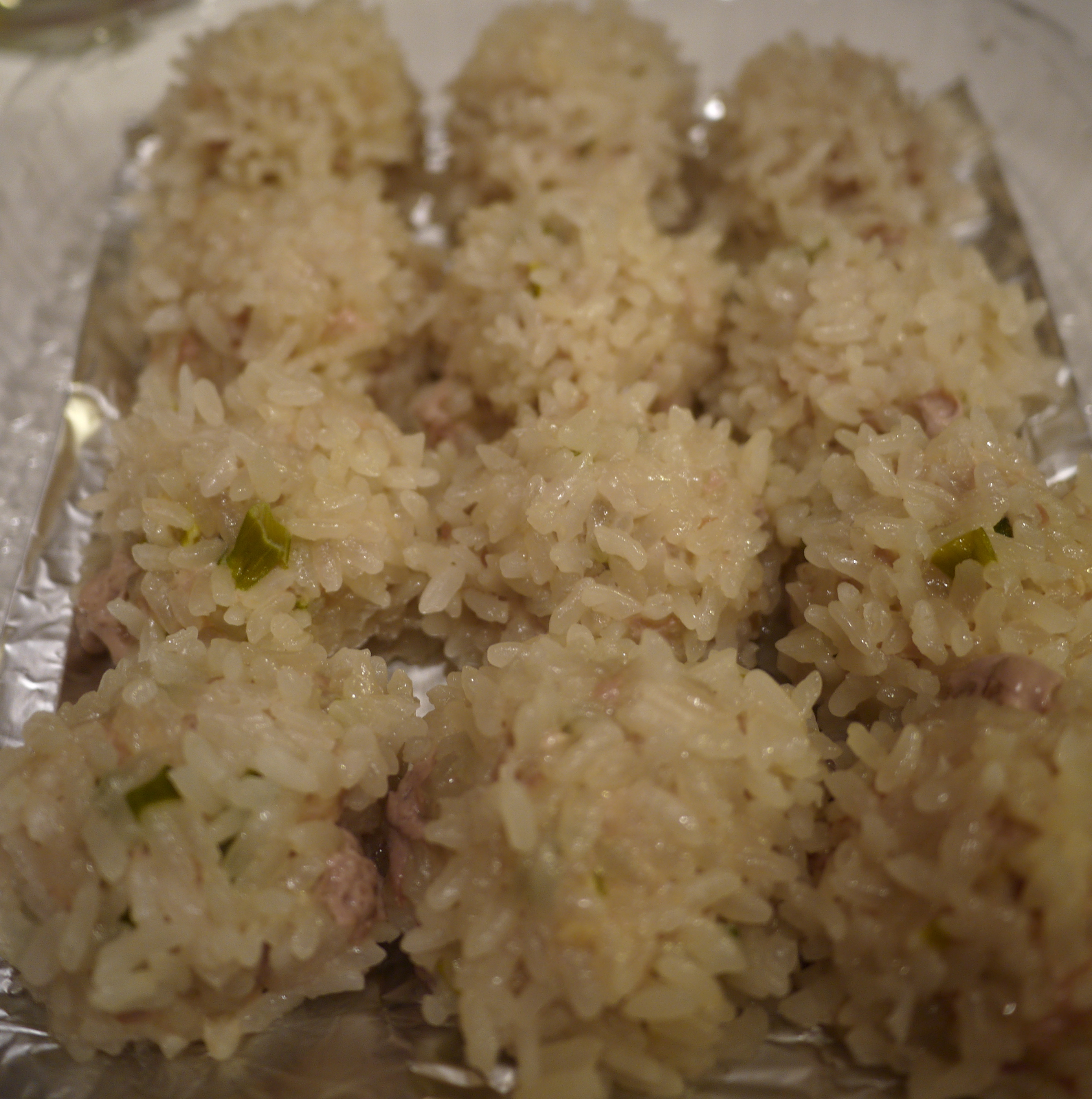 Line a baking tray with parchment paper. Using an ice cream scooper and your palms, pass the pork back and forth until a round ball forms. Place on the parchment paper and repeat. Then, place the baking sheet in the freezer for 10-15 minutes to firm up the rice balls.