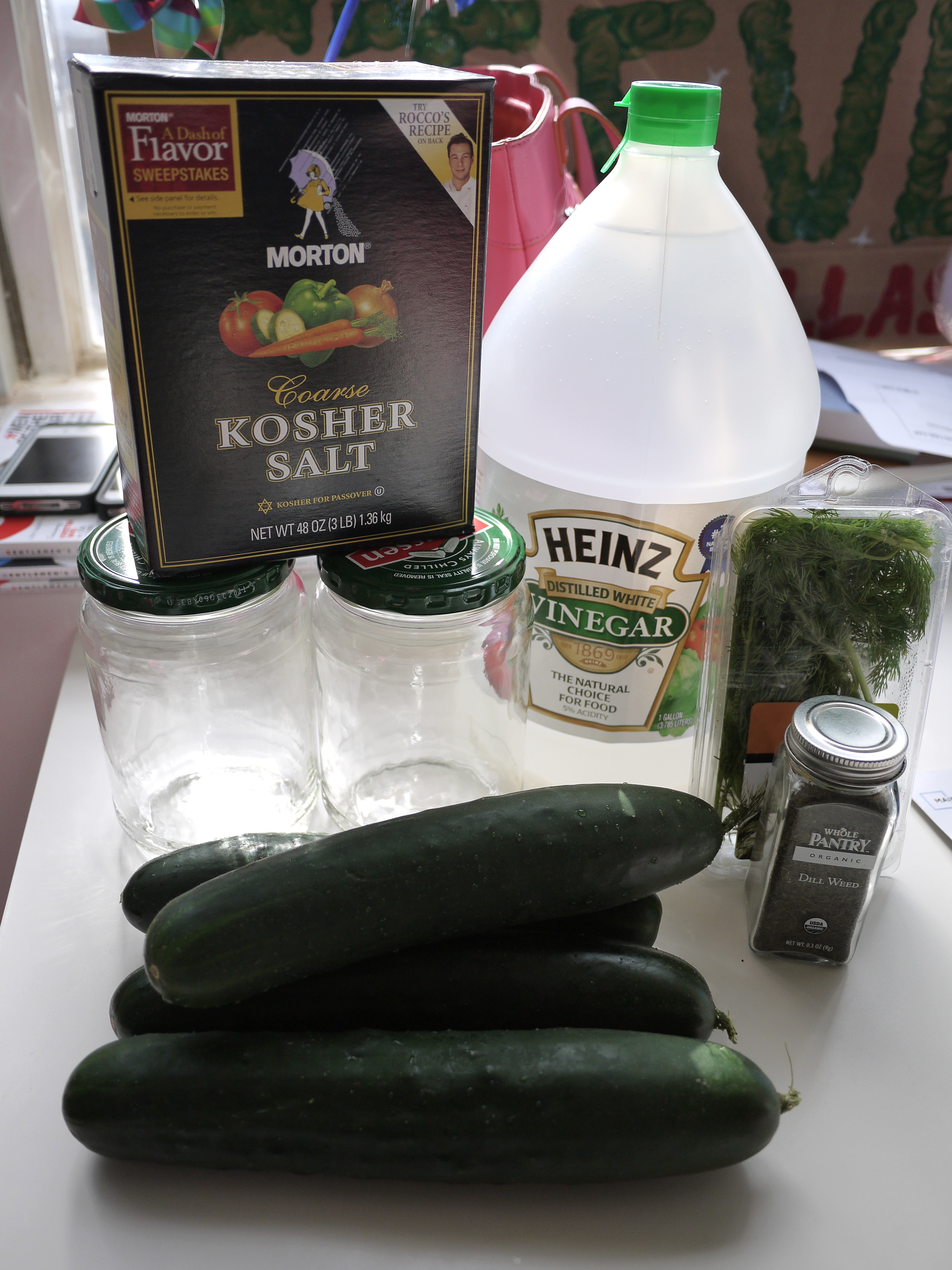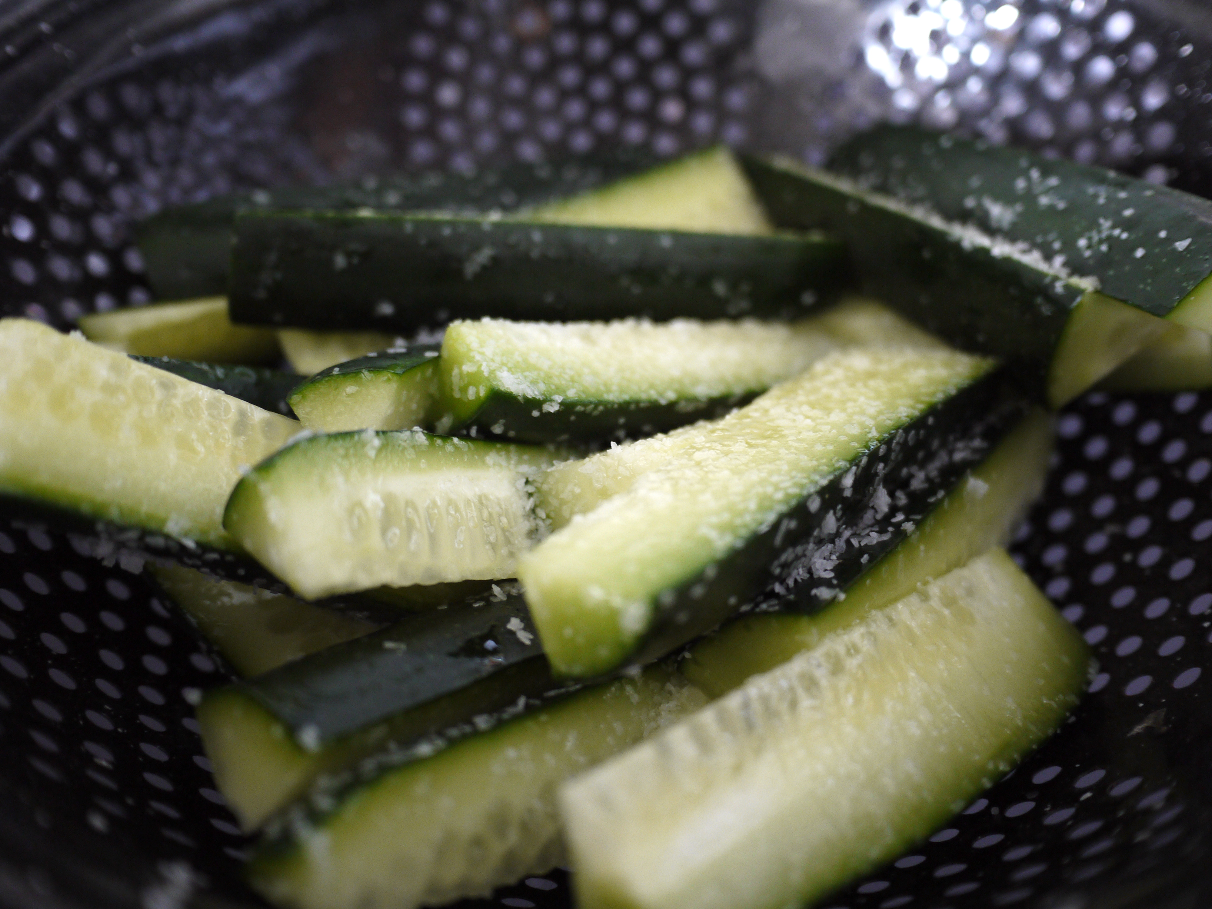 Cut the cucumbers into spears or slices, whatever you fancy. Place them into a strainer and drizzle salt all over them. The salt will draw out the water, which makes for more crisp pickles and it also absorbs more of the vinegar flavor later. Place in the fridge and let the pickles sit in salt for 1 hour; be sure to put a bowl or plate underneath to catch the liquid.