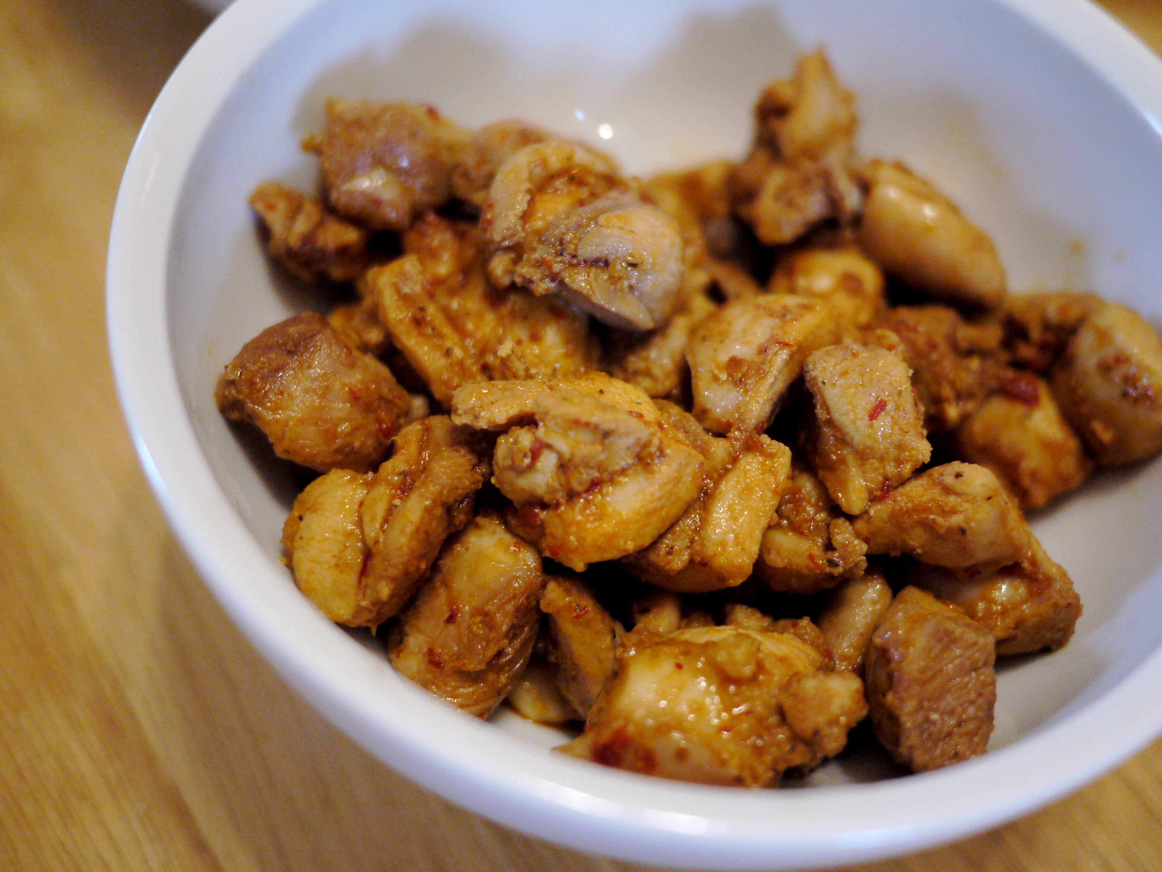 Add all of the ingredients for the chicken (except the chicken, of course) into a blender or food processor until it turns into a paste. Marinate the chicken in the paste overnight or at least 6 hours.