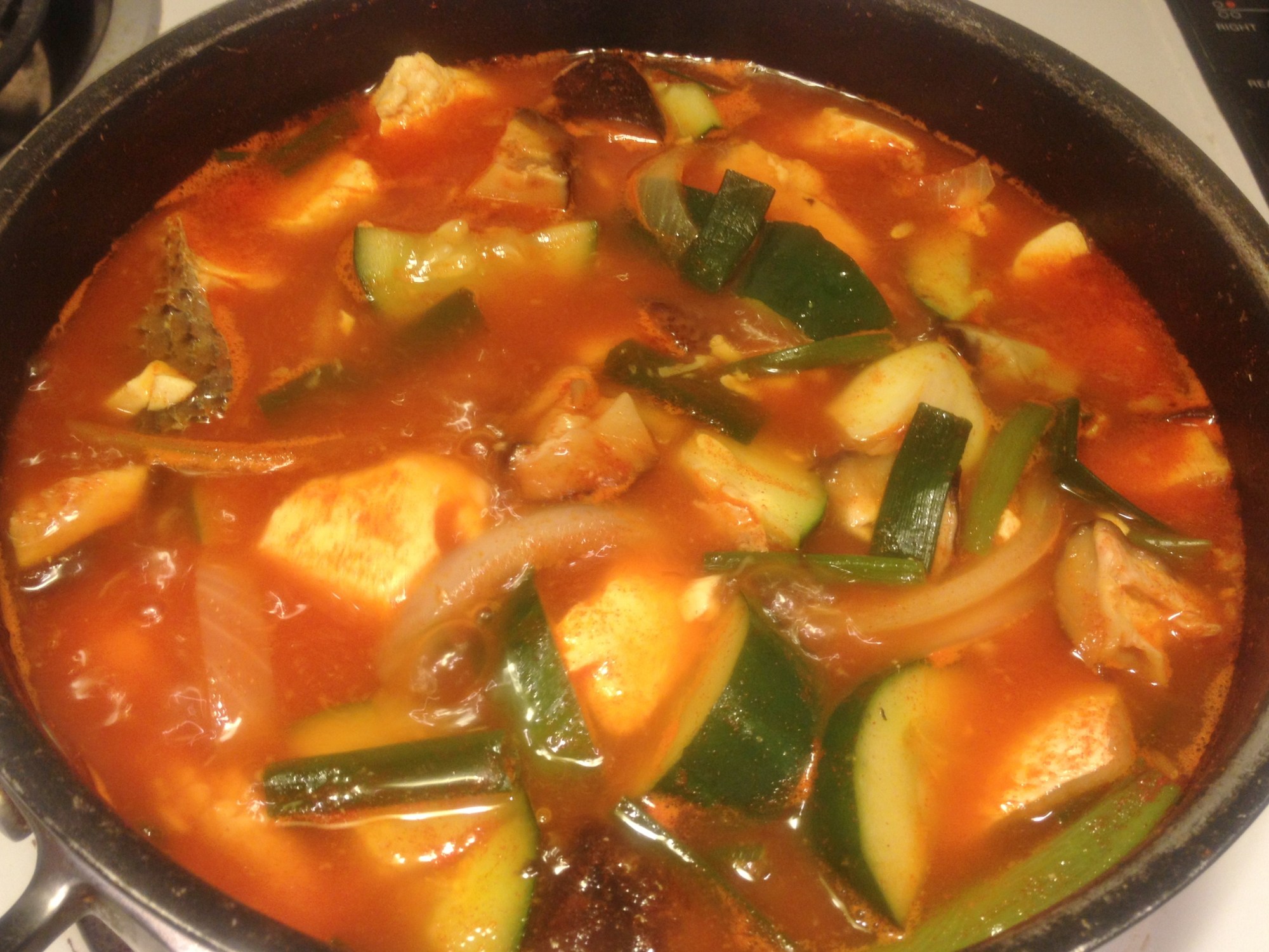 I couldn’t find the soondubu tofu at the chinese supermarket, so I ended up using extra soft tofu, which turned out just fine too. I also didn’t have a clay pot, so I just made mine in a regular stockpot. Still good! Since my mom doesn’t eat beef, I added striped bass fillets and some cucumbers for some greens. Thanks Maangchi!