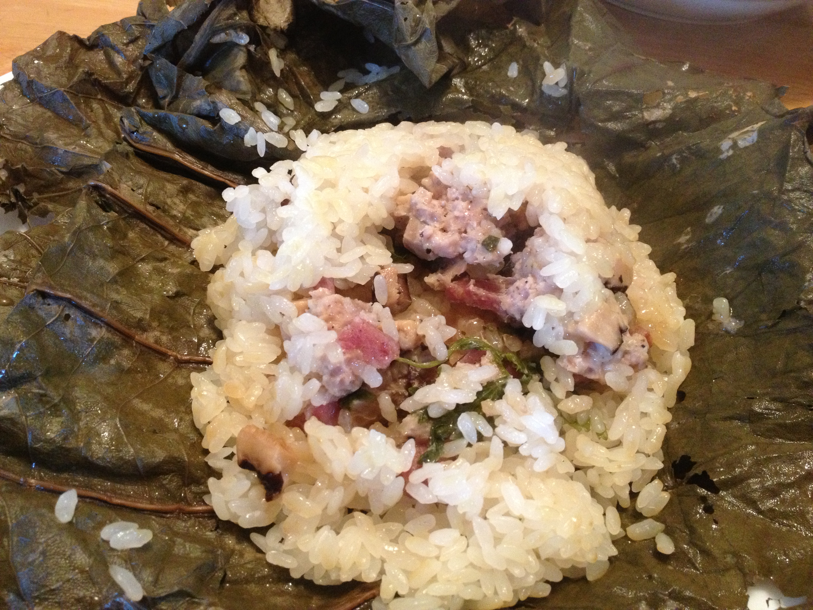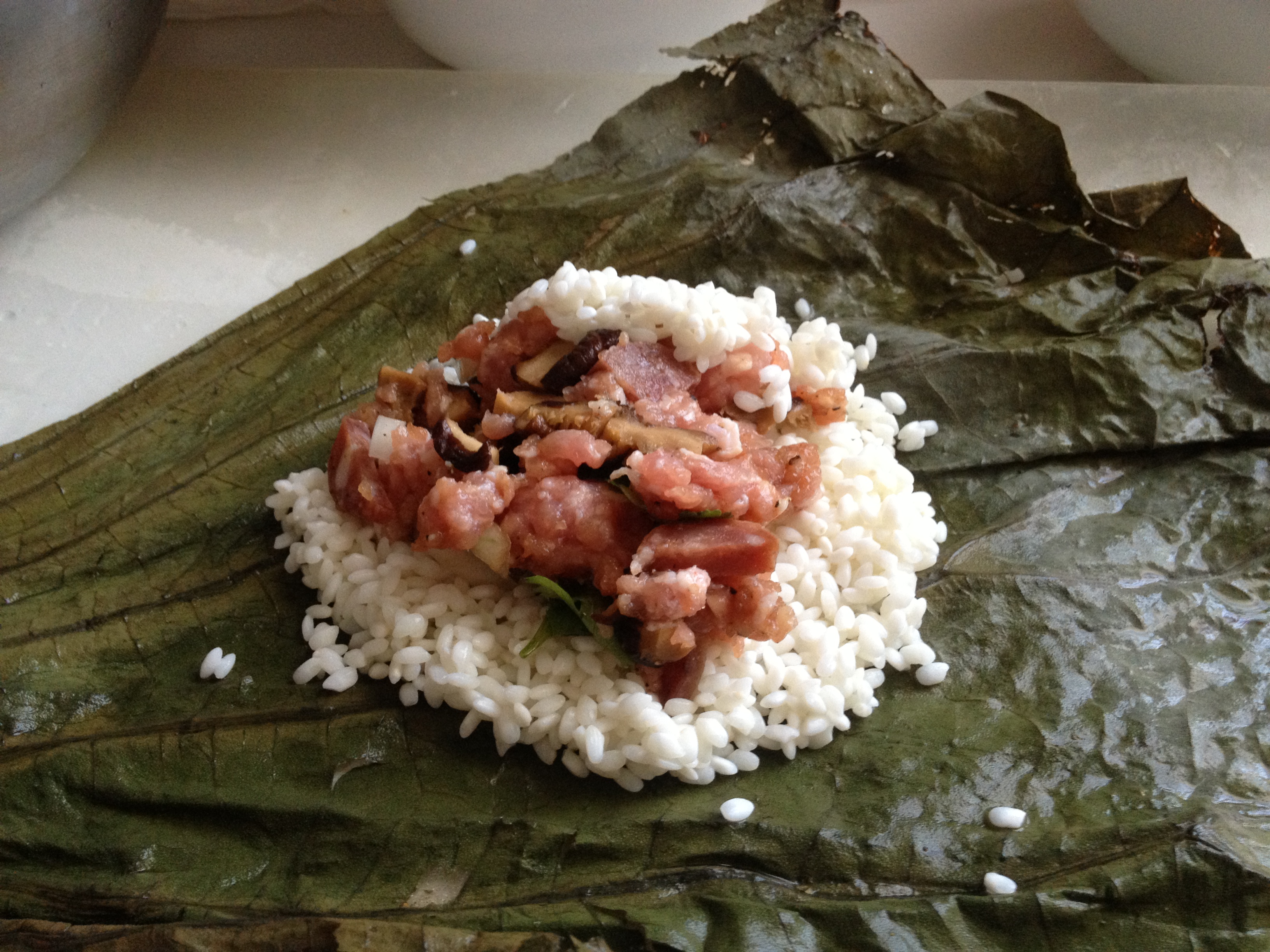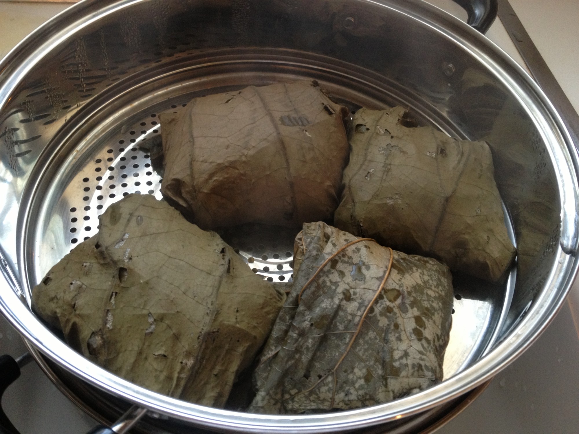 Prep work: Soak the rice in water for at least one hour, the longer the better. Cut the lotus leaves in half and soak completely in warm water for at least an hour.