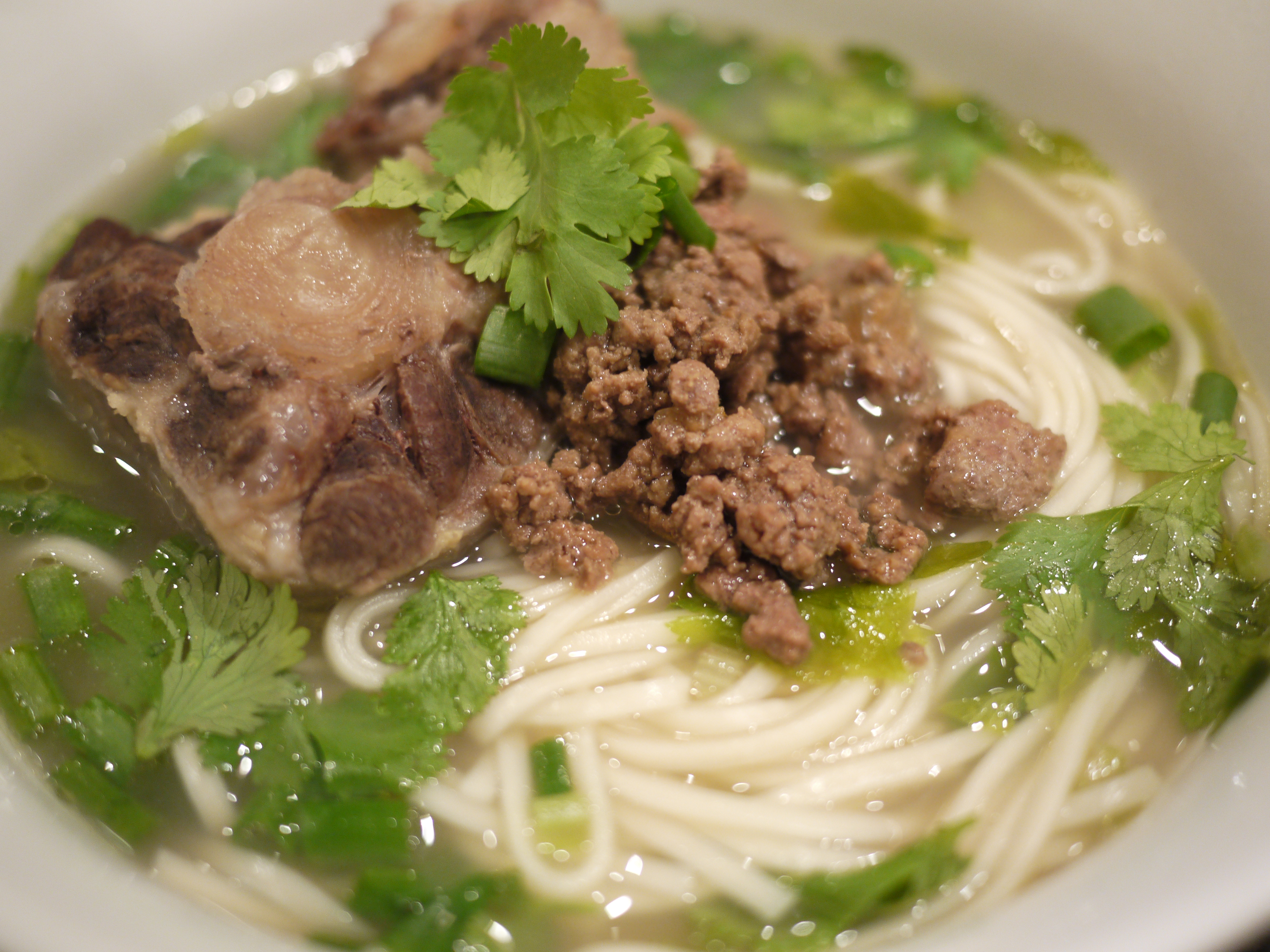 Meanwhile, boil noodles and chop up green onions, chinese celery and/or cilantro for garnish. I also stewed some ground beef sauce as well to add a bit more flavor.