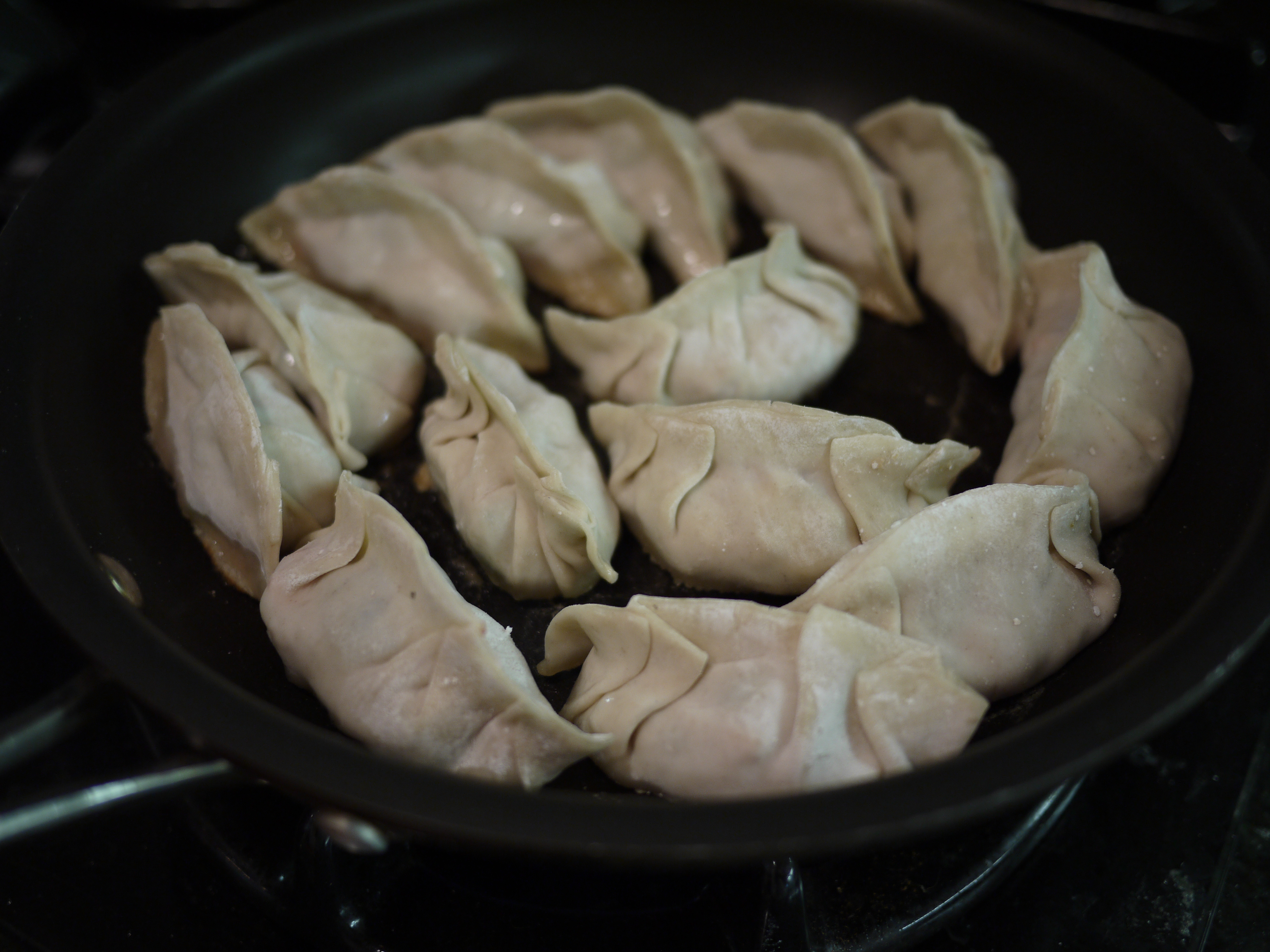 If you are making potstickers, pour a teaspoon of oil into a frying pan over high heat. When the oil gets hot, gently place your potsticker–flat side down–into the pan. Careful for splattering hot oil.