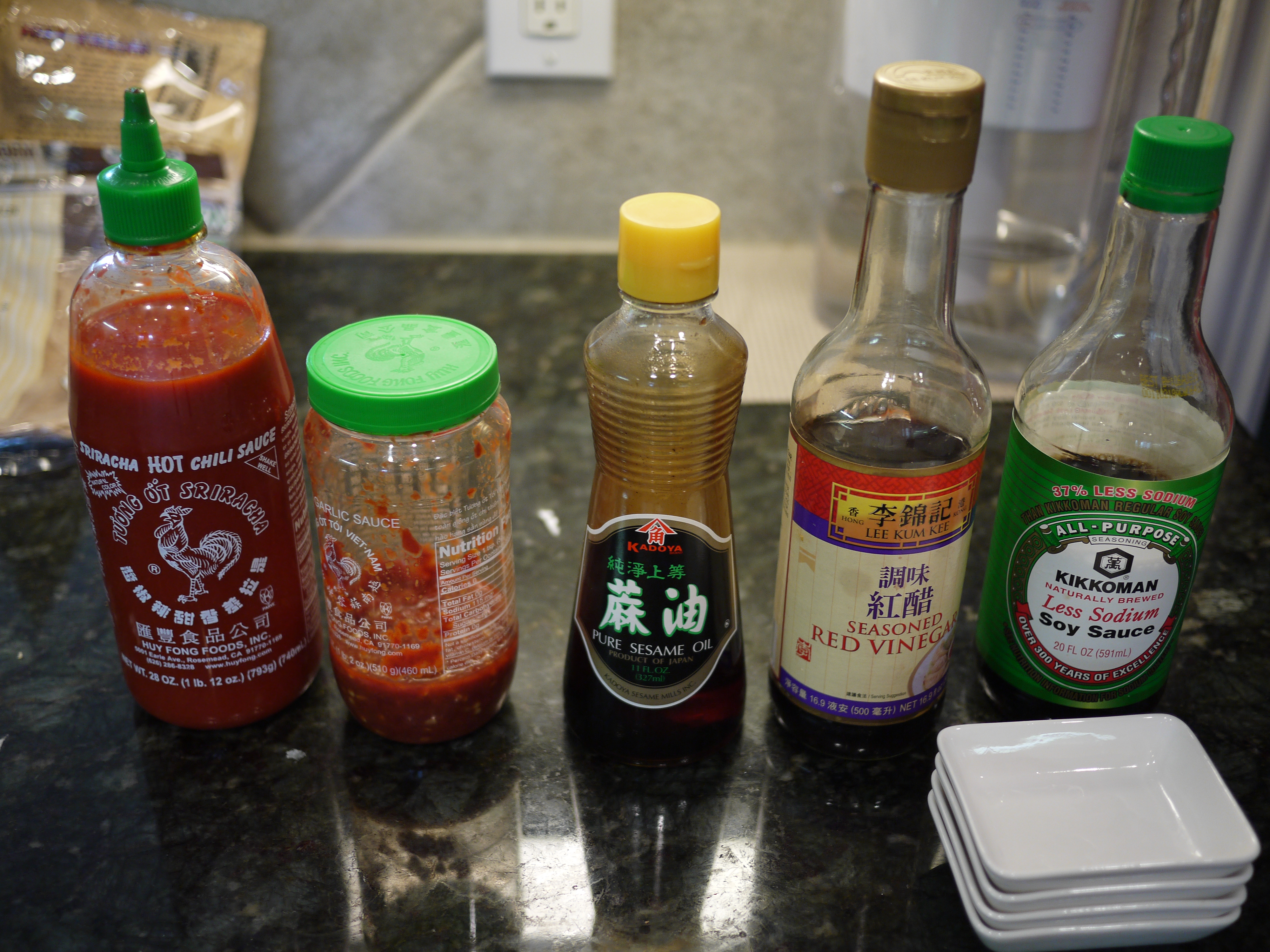 For the dipping sauce, I use a mixture of soy sauce, sesame oil, red vinegar, and chili garlic paste. Proportions vary by person. =)