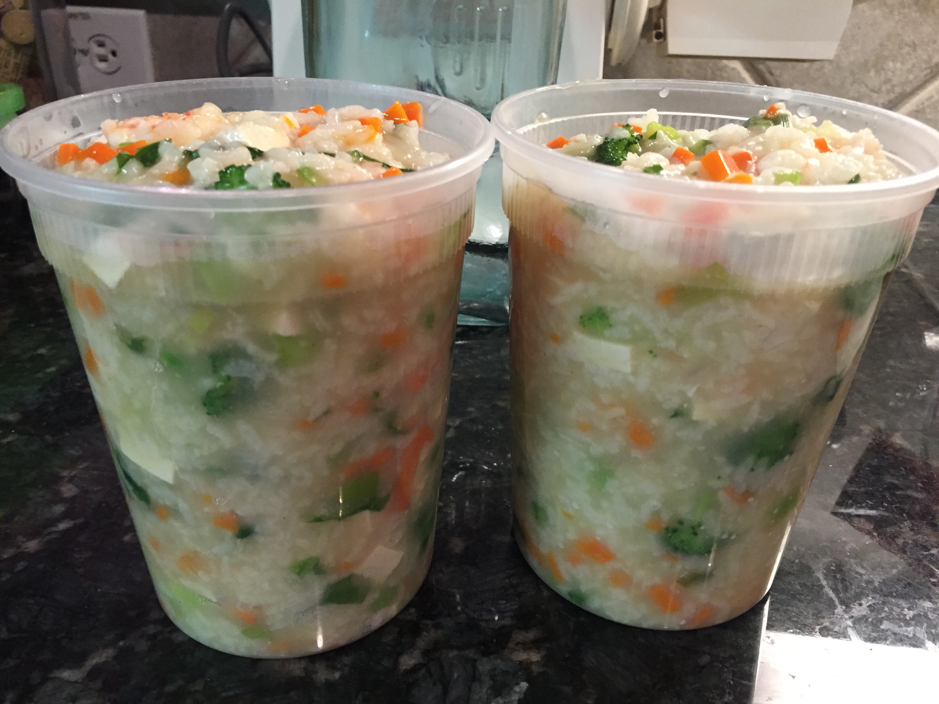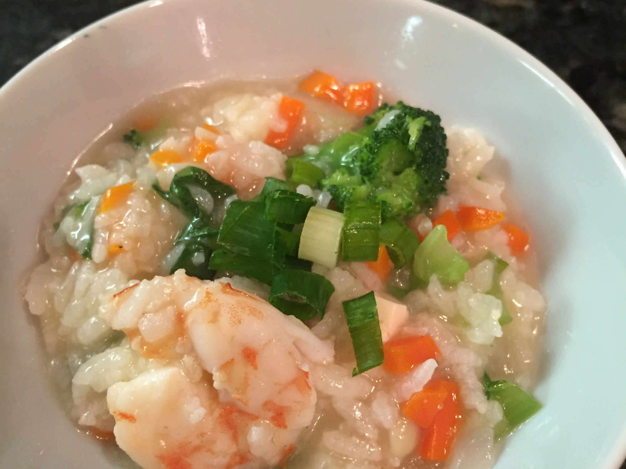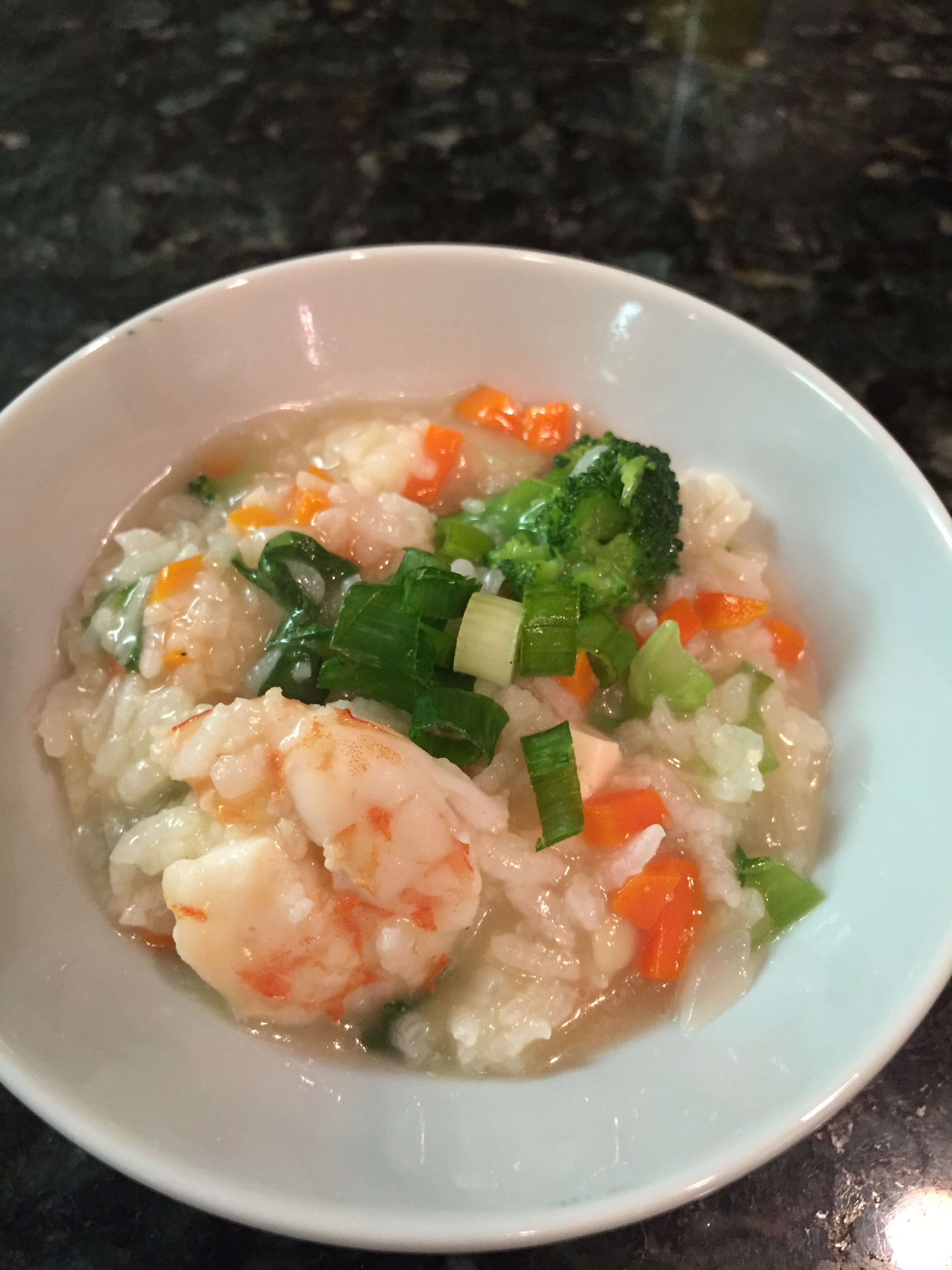 When the mixture has absorbed most of the water, add in the sesame oil, and then the salt and white pepper for taste (aka as much as you think tastes good). Fold in the broccoli and chopped green onions. I peeled some shrimp and boiled them whole for 1-2 minutes. Afterwards, I folded them into the congee as a final step. Total cooking time on the stove should be roughly 35-40 minutes.