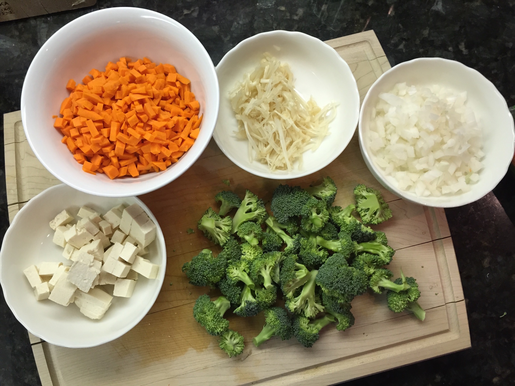 In a large stockpot (around 8-10 quarts), saute the onions and carrots (or any other vegetables that take more time to cook) on medium-high for 2 minutes, just enough until the onions are translucent. Drain the water from the rice and add the rice to the stockpot. After 2 minutes, add in 2 cups of chicken stock and 2 cups of water. Cover until the mixture comes to a boil, stirring occasionally so the rice doesn’t stick to the bottom of the stockpot. After 10-15 minutes, or when the rice has absorbed a good amount of the water, add the remaining chicken stock and water. When this comes to a boil, add the tofu, mushrooms, and Chinese greens.