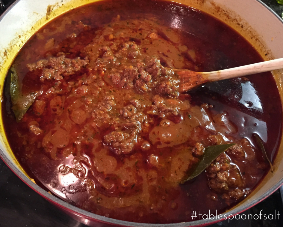 Add water to the pan until the water is about 1 inch above the meat. Toss in the bay leaves, thyme, and oregano. Bring to a boil and reduce to a simmer, stirring occasionally. In Anne’s recipe, she says that as the water evaporates, you’ll need to add more water. I actually didn’t end up adding any more water. Maybe it’s because I used a dutch oven instead of a regular pot? Or maybe I added too much water in the beginning?