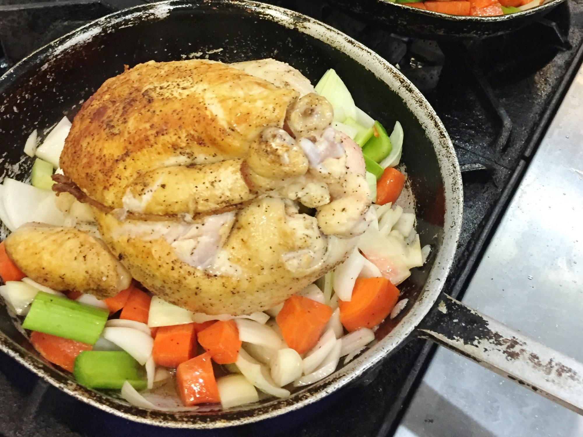 Heat up an ovenproof pan over high heat, coating the bottom with a generous amount of oil. Brown each side of the chicken, starting with the breast side down. Add the onions, carrots, and celery to the bottom of the pan and place the chicken on top, breast side up.